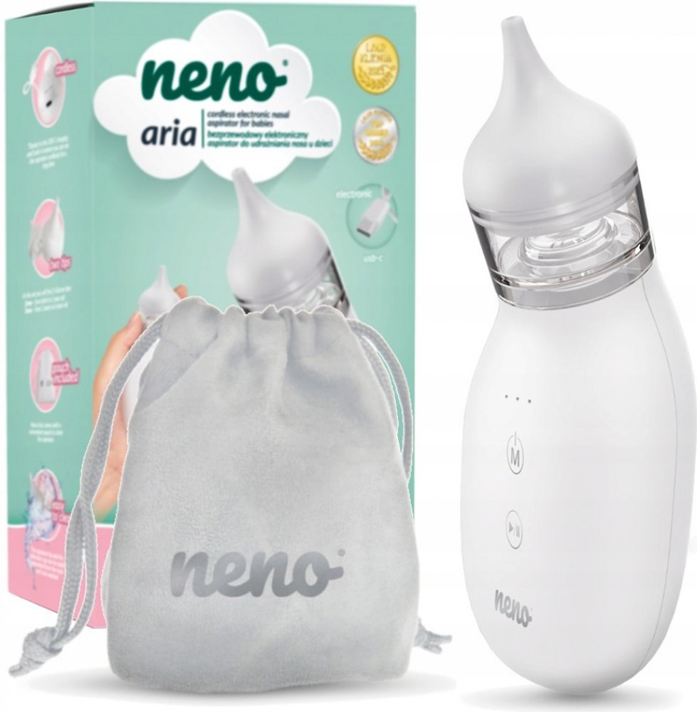 Neno Aria je moderní bezdrátová nosní odsávačka. Je lehká a snadno se používá, poskytuje jemné a zároveň přesné čištění dětského nosíku. Nastavitelný sací výkon a přiložené koncovky umožňují přizpůsobit sací výkon hustotě sekretů a věku děťátka.