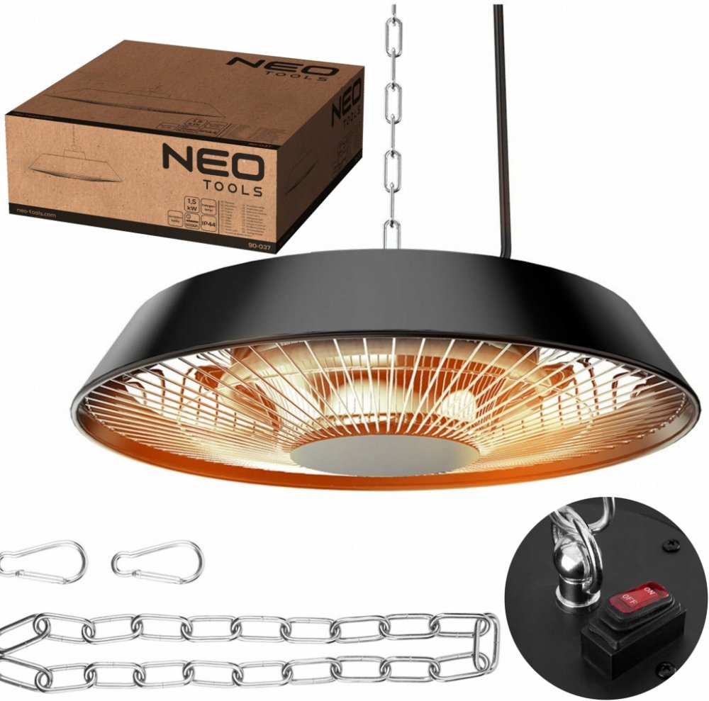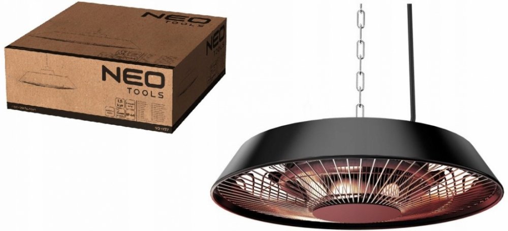 Stropní sálavé topidlo 1500W, hliníkové, bez dálkového ovládání, vypínač, topné těleso s halogenovou žárovkou, IP44 Stropní zářič NEO (ref. 90-037) s výkonem 1500 W je infračervené zařízení, které přeměňuje elektrickou energii na teplo. Díky vyzařovaným paprskům je cítit příjemné a zdravé teplo, podobné pobytu na slunci. Sálavé topidlo dosáhne plného topného výkonu ihned po zapnutí. Díky stupni krytí IP44 je odolný vůči nepříznivým povětrnostním podmínkám a lze jej používat v interiéru i exteriéru. Možnost instalace: strop, terasa, zahradní domek.