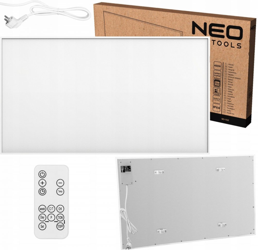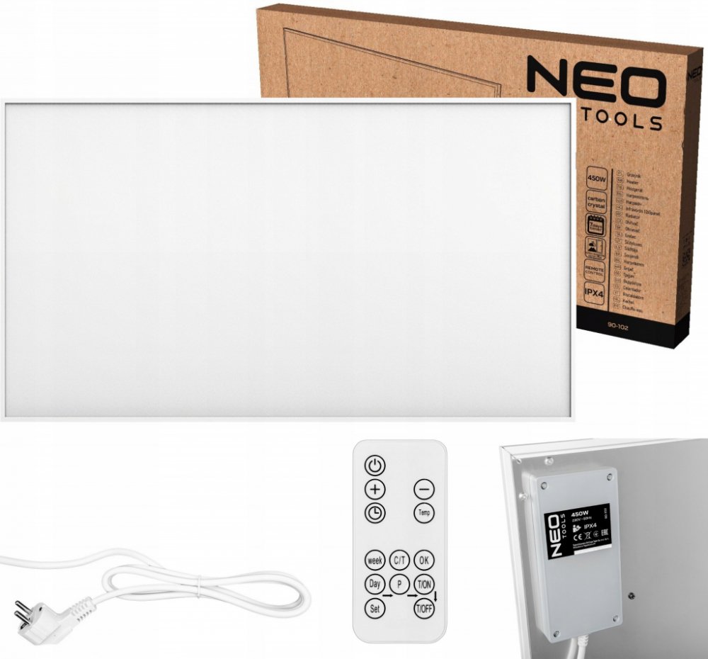 Efektivní a moderní infračervený topný panel s výkonem 450 W od značky NEO . Je to vynikající alternativa k energeticky náročným a neefektivním starším ohřívačům. Tento inovativní panel je vybaven LED displejem a dotykovým ovládáním . Součástí balení je i praktické dálkové ovládání, které umožňuje týdenní ovládání zařízení. Panel umožňuje nastavit teplotu vytápění v rozmezí 16 až 37 °C . Další možnosti, jako je detektor otevřeného okna a funkce odmrazování , chrání zařízení, zvyšují jeho výkon a prodlužují jeho životnost. Dva vestavěné termostaty jej chrání před přehřátím. Cenově výhodný způsob vytápění Infračervené topné panely jsou účinnější než standardní topidla (ventilátorové ohřívače) . Výpočty ukázaly, že panely potřebují k vytápění stejné místnosti až poloviční výkon než napříkl