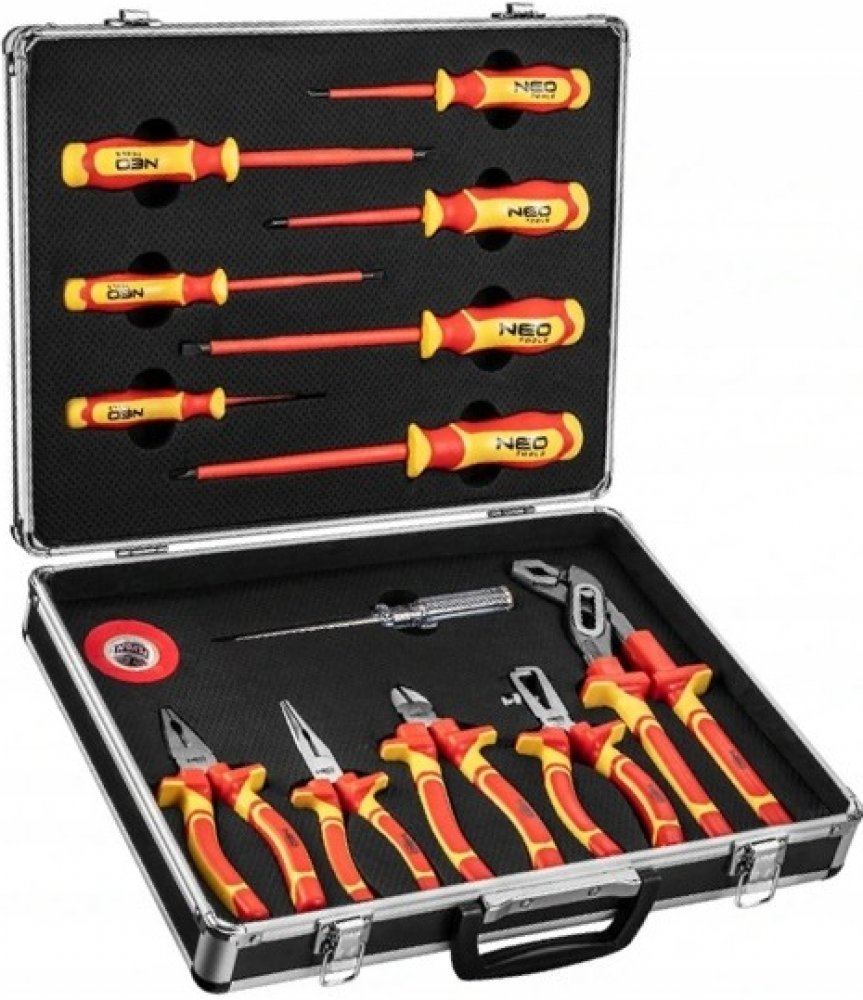 Sada kleští a šroubováků 1000V, 13 ks., rukojeť ze dvou materiálů, kleště z oceli CrV, šroubováky z oceli S2, certifikát TÜV, 7 ks šroubováků: PH0*3*60 mm, PH2*6*100 mm, PH1*4,5*80 mm, 1,8*8*175 mm, 1,0*5,5*125 mm, 0,8*4*100 mm, 1,0*6,5*150 mm, 1 ks. 160 mm kombinované kleště1 ks. 160 mm boční frézy1 ks. 160 mm kombinované kleště1 ks. Izolační kleště 160 mm, 1 ks. 10"" kleště na trubky,1 ks.190 mm elektrikářská zkoušečka 1000V Sada nářadí NEO (č. 01-234) obsahuje 13 prvků: včetně šroubováků a kleští. Testováno pro práci pod napětím až 1000 V. Čepele šroubováků jsou vyrobeny z extrémně odolné chrom-molybdenové oceli. Čelisti kleští jsou kované z chrom-vanadiové oceli. Dvě materiálové ergonomické rukojeti zvyšují pohodlí při práci. Spolehlivost výrobku potvrzuje 25letá záruka. Značka NEO splňuje očekávání profesionálů.