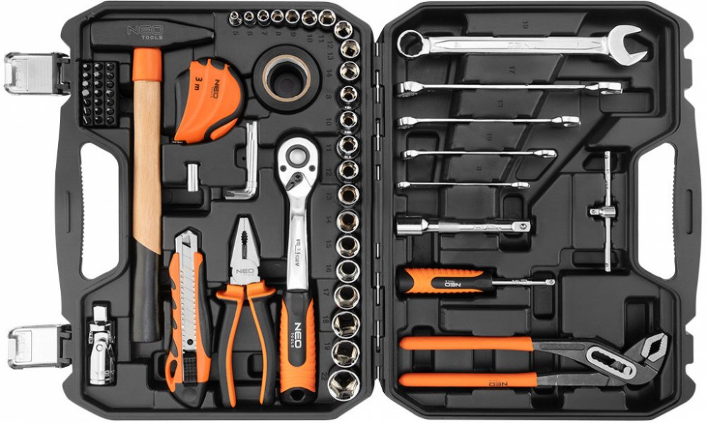 Sada nářadí NEO TOOLS obsahuje 65 dílů vybraných tak, aby poskytovaly praktickou sadu s nejpotřebnějšími základními nástroji pro domácnost a garáž. Nástroje jsou vyrobeny z vysoce kvalitních ocelí CrV a S2. Celá sada je uložena v praktickém pevném kufříku s kovovými sponami. Kvalita nářadí byla mezinárodně certifikována TÜV a přislíbena s 25letou zárukou od výrobce. Značka NEO splňuje očekávání profesionálů. Sada obsahuje: 1/2 "nástrčných klíčů 12 ks: 8, 10, 11, 12, 13, 14, 15, 16, 17, 18, 19, 22 mm, 1/4" nástrčné klíče 10 ks: 5, 6, 7, 8, 9, 10, 11, 12, 13, 14 mm, univerzální kloub 1/2 ", ráčna 1/2" 72 zubů, adaptér bitů: 1/4 "čtyřhran 1/4" šestihran, bity 21 ks: TX - 8, 10, 15, 20, 25, 30; PH - 1,2 x 2 ks, 3; FD - 4,5, 5, 7 mm; PZ 1,2 x 2 ks, 3; HEX, 3, 4, 5, 6; Šestihranné klíče 5 ks: 1,5, 2, 3, 4, 5 mm, kombinované klíče 5 ks: 8, 10, 13, 17, 19 mm, průchozí rukojeť typu "T" 1/4 "115 mm, rukojeť 1/ 4 "šroubovák, klíč na trubky 250 mm, kladivo 300 g, univerzální kleště 160 mm, kapesní míra 3 m, nůž se zlomenou čepelí 18 mm, izolační páska 10 m
