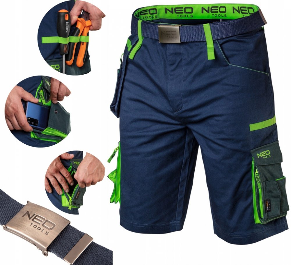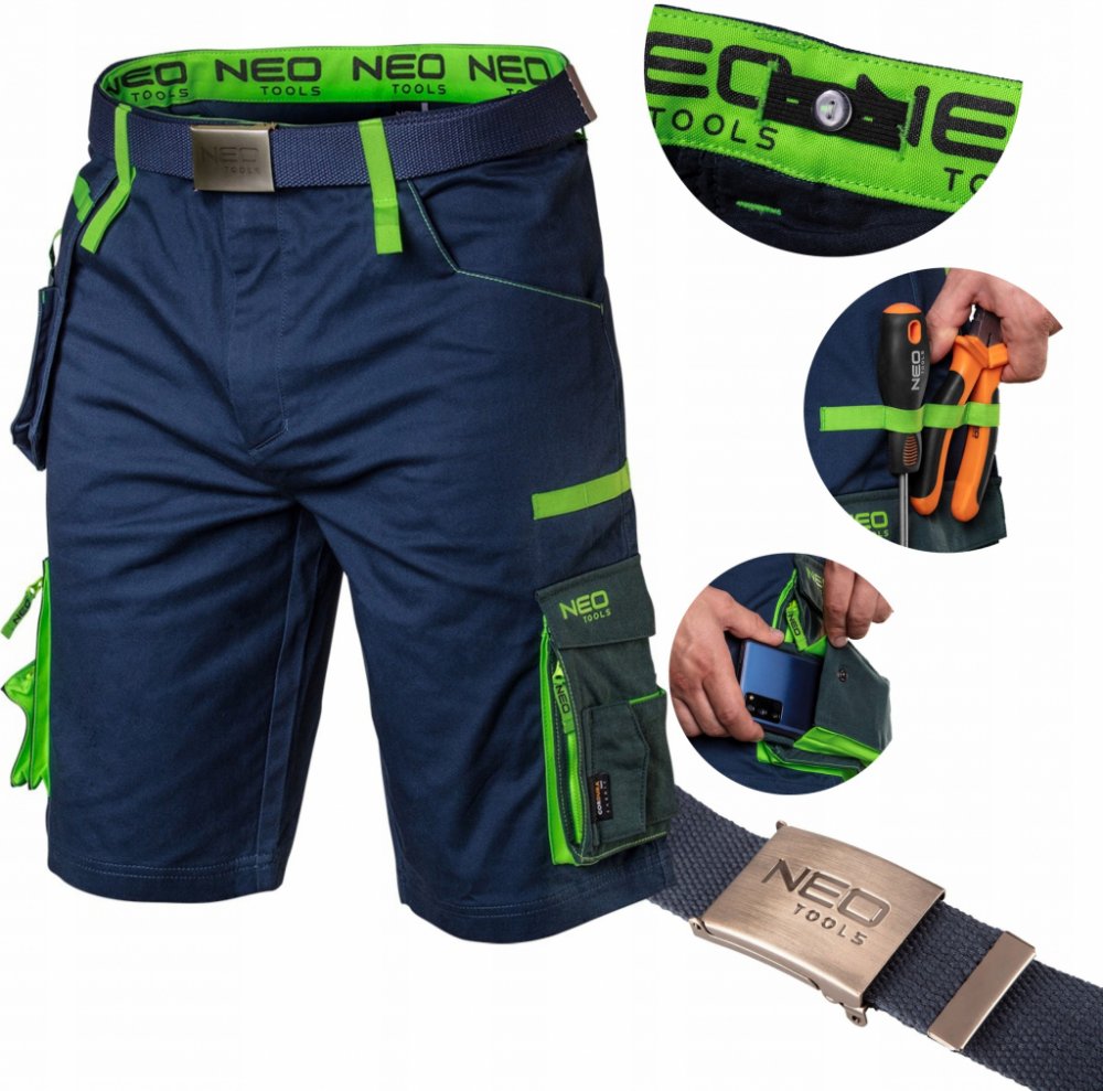 Staňte se králem dílny s pracovními kraťasy NEO Tools. Jsou velmi odolné, praktické a přitom stále komfortní. Má velké kapsy nejen pro umístění vašich nářadí, ale také kapsu přizpůsobenou pro mobilní telefon. Má jednu odnímatelnou kapsu. Velikou výhodou jsou poutka, do kterých můžete zasunout vaše nejpoužívanější nářadí! Modré pracovní kraťasy, 62% bavlna, 35% polyester, 3% elastan, hmotnost 270 g...