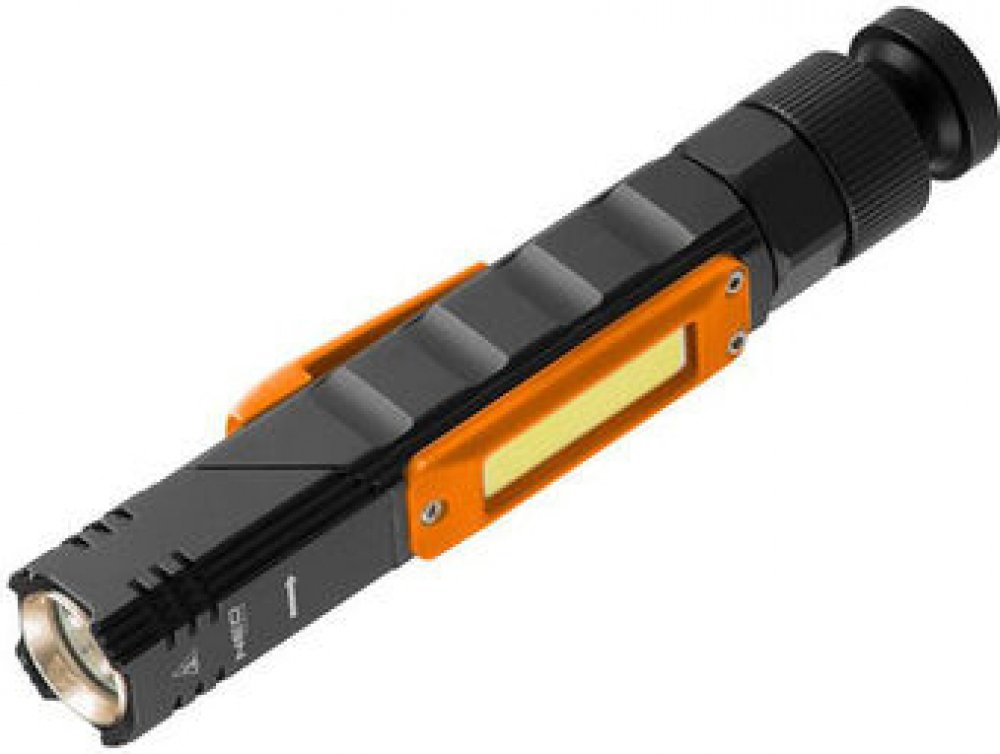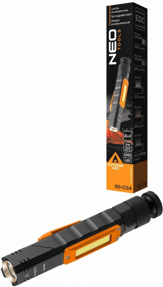 Nabíjecí svítilna 2 v 1 je vybavena 3W CREE XPE + COB LED (300 lumenů). Má maximální dobu svícení 8 hodin a maximální dosah svícení 70 m. Svítilnu napájí přiložený 3,7V Li-Ion akumulátor s kapacitou 2000 mAh. Svítilna má 5 funkcí svícení: 100% svítilna, 50% svítilna, 100% boční světlo, boční červené světlo, boční stroboskop. IP20 poskytuje ochranu proti úrazu elektrickým proudem při dotyku prstem, ale nechrání před účinky vody. Otočná konstrukce hlavy v rozsahu 180 stupňů., 99-034