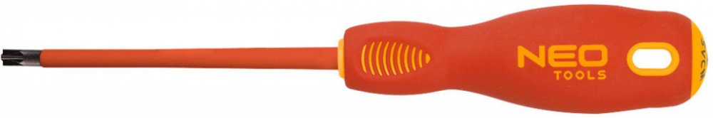 Šroubovák NEO plus-minus 1000 V (ref. 04-222). Schváleno pro práci pod napětím do 1000 V. Čepel šroubováku je vyrobena z odolné CrV oceli. Pracovní hrot čepele byl tepelně zpracován, což se projevilo v přiměřené tvrdosti a odolnosti vůči ohýbání. Speciální hrot je určen pro pojistky typu S. Trojúhelníkový tvar rukojeti s tvarovanou opěrkou pro palec snižuje zatížení ruky při práci a usnadňuje dosažení optimálního točivého momentu. Rukojeť z dvojitého materiálu zabraňuje klouzání v ruce a je odolná vůči chemikáliím, olejům a tukům. Kvalita nářadí s 26letou zárukou výrobce.