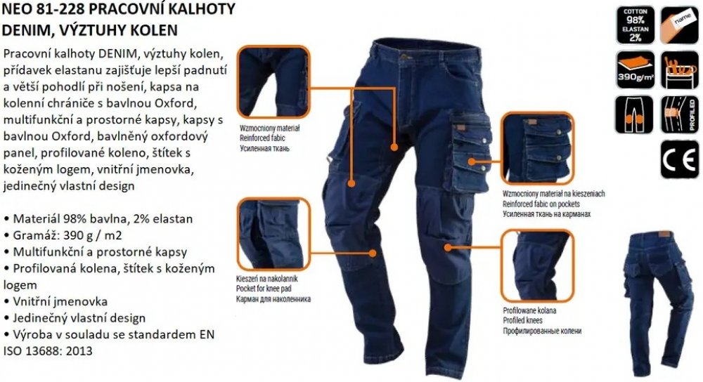 5-kapsové pracovní kalhoty z kolekce NEO DENIM byly navrženy v Polsku technology oblečení NEO s ohledem na každý detail a zachování stylu. Kalhoty jsou pohodlné, módní a praktické – přídavek elastanu zvyšuje komfort nošení a všivky z bavlněného oxfordu chrání před oděrkami. Kvalita pracovního oblečení se skvěle hodí jako každodenní oblečení. Charakteristické vlastnosti: Přídavek elastanu zajišťuje lepší přizpůsobení a větší komfort při nošení; kapsa na chrániče kolen vyztužená bavlněným Oxfordem; multifunkční a prostorné kapsy; kapsy vyztužené bavlněným Oxfordem; panel z bavlněného Oxfordu v rozkroku; profilované koleno; kožené všivky s logem; vnitřní jmenná všivka; jedinečný vlastní design; certifikát CE podle normy EN ISO 13688:2013. Dostupné velikosti XS-XXXL.