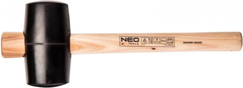Gumové kladivo NEO (č. ref. 25-053) o hmotnosti 680 g a průměru ucha 75 mm nachází své použití především při stavebních, dokončovacích, montážních a klempířských pracích, protože guma nepoškodí křehký materiál. Násada je vyrobena z odolného hikorového dřeva. Gumový obouch je upevněn pomocí klínu na kuželové násadě, což zajišťuje bezpečnost během používání. Garantem vysoké kvality a spolehlivosti výrobku je certifikát TÜV společnosti Rheinland. Značka NEO splňuje očekávání profesionálů.