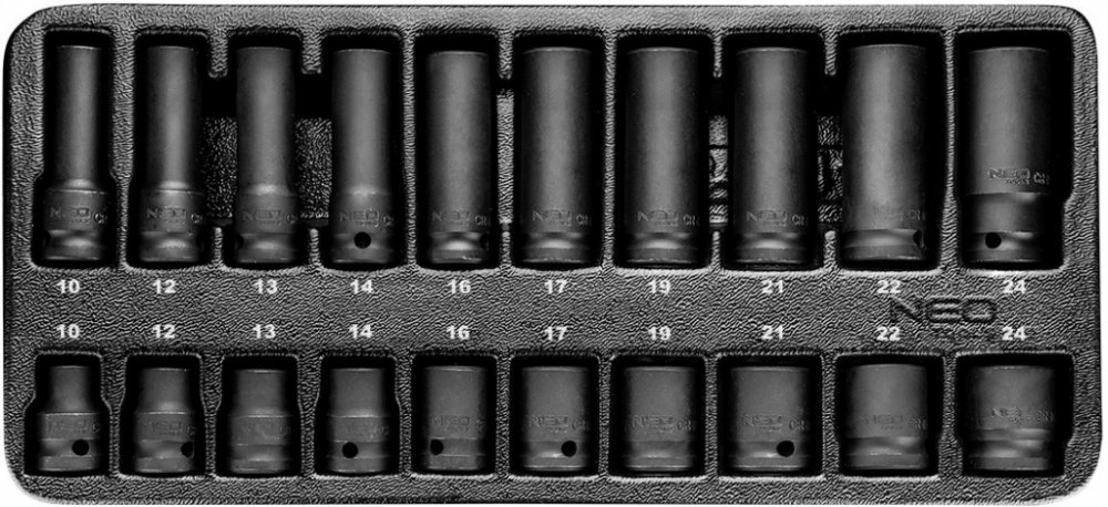 Šestihranné úderné hlavice, 1/2\', sada 20 ks, rozměry: délka 38 mm - 10, 12, 13, 14, 16, 17, 19, 21, 22, 24 mm, délka 78 mm - 10, 12, 13, 14, 16, 17, 19, 21, 22, 24 mm, CrMo ocel Sada úderných hlavic 1/2\' NEO obsahuje 20 ks nástrčných hlavic o dvou délkách 38 a 78 mm, o rozměrech od 10 do 24 mm. Vyrobeno z odolné chrom-molybdenové oceli. Hrubší stěny nástrčných hlavic zaručují jejích vysokou odolnost. Vše dodáváno v plastovém výlisku pro zásuvky skříní na nářadí NEO 84-221 a 84-222. Spolehlivost výrobku potvrzuje záruka výrobce na 25 let. Značka NEO splňuje očekávání profesionálů.