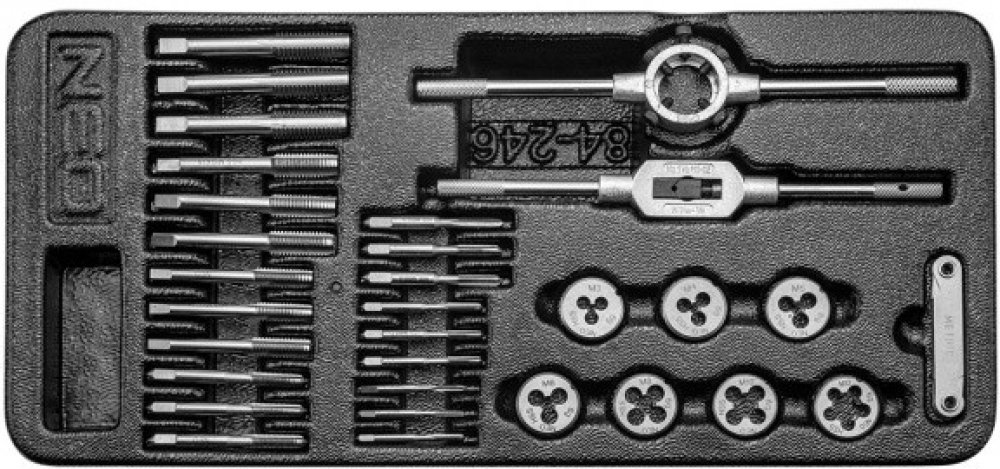 Závitníky a závitníky, Neo (ref. 84-246) ocel HSS, velikosti závitníků: M3, M4, M5, M6, M8, M10, M12, závitníky velikosti M3, M4, M5, M6, M8, M10, M12, držák závitníků, závitoměr Závitníky, Neo (ref. 84-246) 31dílná sada závitníků a závitníků je nezbytným nástrojem v každé dílně nebo garáži. Vyrobeno z nejkvalitnější rychlořezné oceli HSS, která zvládne jakýkoli úkol. Dodává se v plastové formě, k...