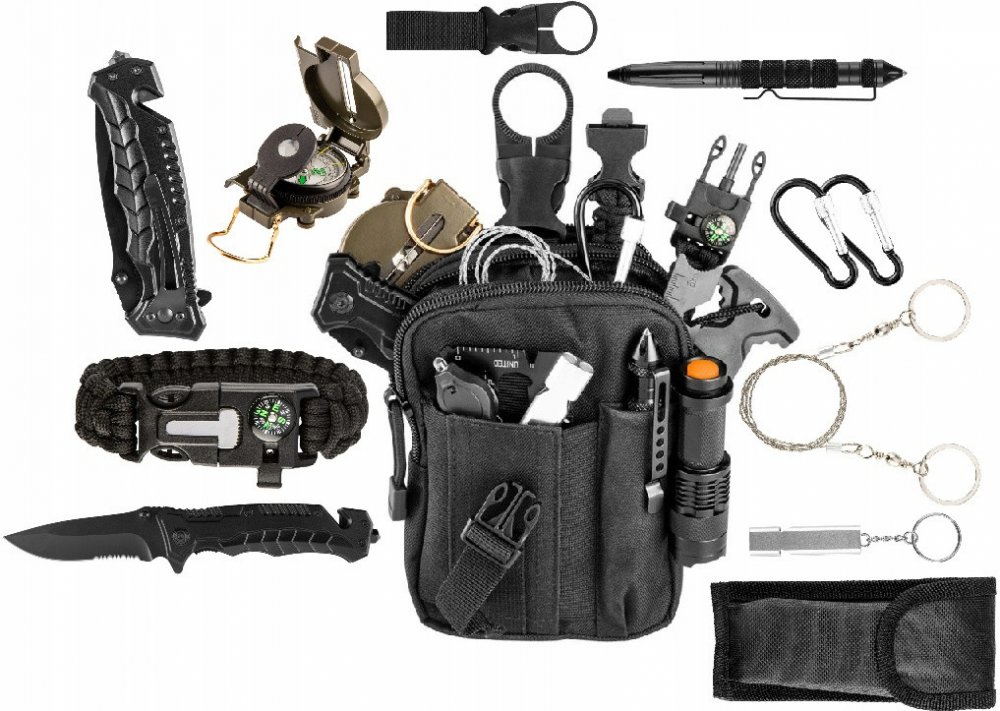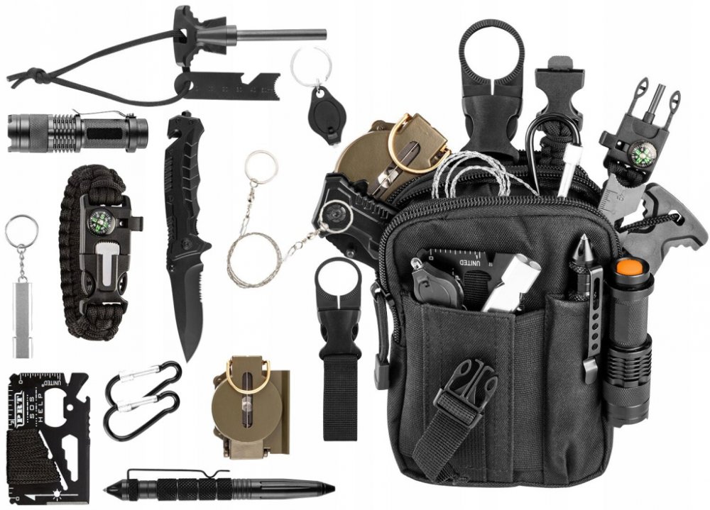 Sada obsahuje: křesadlo, zavírací nůž, svítilna, náramek na přežití, píšťalka, multifunkční karta, drátěná pila, taktické pero, svorka na láhev, kompas, 2 karabiny, mini svítilna s klíčenkou, taška.