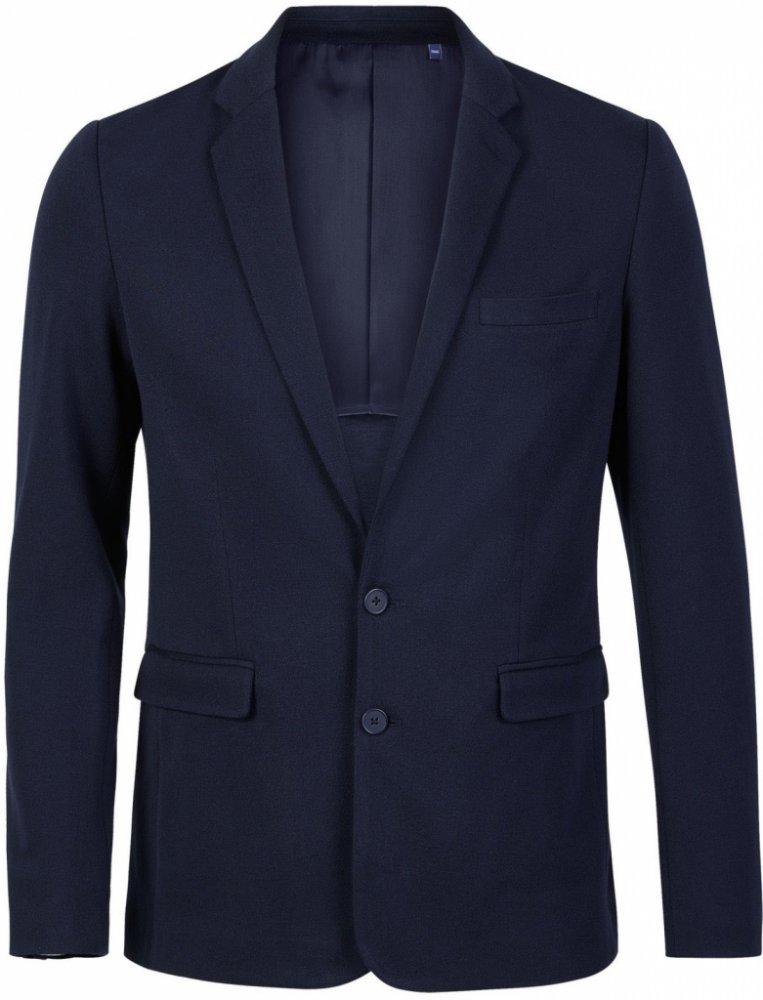 Pánské sako s límcem na klopě a zapínáním na dva knoflíky. Na přední straně je náprsní kapsa a 2 kapsy s klopou. Má poloviční podšívku. Na zadní straně rozparek.