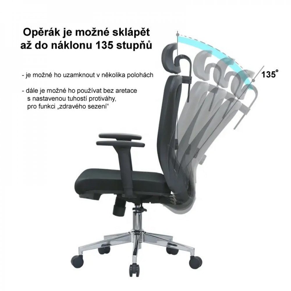 Zádovou opěrku je možné polohovat až do náklonu 135 stupňů a aretovat v mnoha polohách náklonu.