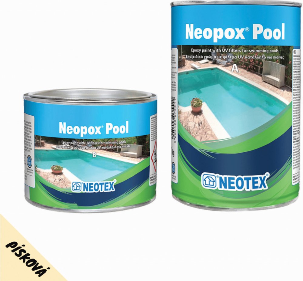 Oblasti použití:Venkovní a vnitřní bazényFontány, vodní nádrže, loděKovové a polyesterové povrchyPovrchy vyžadují vhodnou přípravu a základní nátěr před aplikací Neopox® Pool.Vlastnosti - Výhody:S integrovanými UV filtry, které poskytují zvýšenou odolnost proti křídění a žloutnutíVysoká odolnost vůči chlorovým chemikáliím v bazénechVynikající odolnost proti oděru a mechanickému namáháníVelmi dobrá přilnavostOdolnost vůči zásadám a zředěným kyselinám, ropným produktům, sladké vodě, mořské vodě a mnoha rozpouštědlůmŠiroký rozsah provozních teplotNávod na použití:Příprava podkladuBeton musí být minimálně třídy C20/25 s pevností v tahu ≥ 1,5 MPa a nechat ho ztvrdnout nejméně 28 dní. Cementový podklad musí být řádně mechanicky připraven (např. broušením, tryskáním, frézováním atd.). Povrch musí být suchý, chráněn před vzlínající vlhkostí, stabilní, čistý a zbavený prachu, mastnoty, oleje atd. Volný sypký materiál musí být úplně odstraněn kartáčováním nebo broušením vhodným strojem a vysavačem s vysokým sacím výkonem. Povrch musí být co nejhladší, nejrovnoměrnější a souvislý (tj. bez dutin, trhlin atd.). Opravy podkladu, vyplnění škár, dutin a vyrovnání povrchu musí být provedeny vhodnými opravnými výrobky, jako je například litá epoxid-cementová malta Epoxol® CM a epoxidový tmel Epoxol® Putty nebo Neodur FT Putty.Kovové povrchy (železo - ocel)Kovové povrchy musí být řádně připraveny pískováním nebo broušením drátěnou kartáčí a musí být suché, zbavené prachu, nečistot, mastných a olejových látek a také špatně přilnavých nátěrů. V rezavých oblastech se doporučuje lokálně aplikovat chemický konvertor rezavění Neodur® Metalforce. Nové kovové povrchy by měly být odmaštěny rozpouštědlem Neotex® 1021.Základní nátěrPro stabilizaci podkladu a uzávěr pórů, a také pro vytvoření optimálních podmínek pro lepší přilnavost a vyšší krytí následného epoxidového nátěru, se doporučuje použít rozpouštědlový epoxidový základní nátěrEpoxol® Primer nebo vhodný alternativní základní nátěr ΝΕΟΤΕΧ® (viz tabulka) v závislosti na povrchu. U podkladů s většími póry může být potřeba další vrstva základního nátěru.AplikaceHladký epoxidový povlak se nanáší po zaschnutí základního nátěru. Po zaschnutí základního nátěru se doporučuje nanést první vrstvu Neopox® Pool zředěnou 8 % hmotnosti rozpouštědla Neotex® 1021 válečkem, štětcem nebo bezvzduchovým stříkáním. Druhá vrstva se nanáší stejným způsobem ~24 hodin po nanesení první vrstvy (závisí také na atmosférických podmínkách), zředěná 4-8 % w/w rozpouštědla Neotex® 1021. Při případných dalších vrstvách se Neopox® Pool ředí 4 % hmotnosti rozpouštědla Neotex® 1021. Obe složky A a B se smíchají v předem stanoveném poměru (75A:25B w/w) a po přidání rozpouštědla se míchají během aplikace po dobu 3 - 5 minut elektrickým míchačem s nízkými otáčkami. Důležité je důkladně promíchat na dně nádoby i po stranách, aby se tuhé složení (složka B) rovnoměrně rozložilo. Směs se nechá krátce působit v nádobě (~1 minuta) a poté se aplikuje. Před mícháním se doporučuje mechanické míchání složky A.Protiskluzový epoxidový nátěr s přídavkem Neotex® Antiskid MPo zaschnutí základního nátěru se Neopox® Pool aplikuje podle výše uvedeného postupu. Během míchání Neopox® Pool před nanesením poslední vrstvy systému se do směsi přidá protiskluzová přísada Neotex® Antiskid M v poměru 1,5-2,5 % hmotnosti. Poté se směs znovu promíchá nízkootáčkovým elektrickým míchačem po dobu ~1 minuty a Neopox® Pool se nanese na povrch válečkem nebo štětcem.