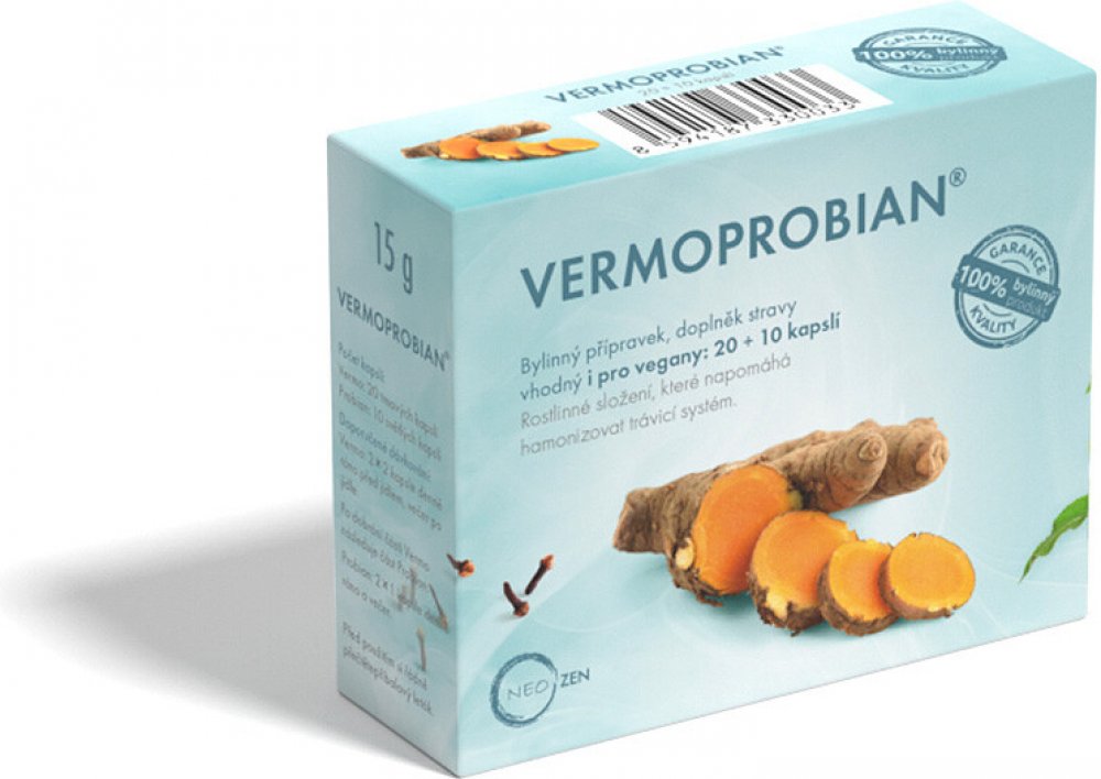 VERMOPROBIAN® je vysoce účinný bylinný přípravek s probiotiky, jenž harmonizuje trávicí systém a povzbuzuje obranné reakce organismu. Složka VERMO navozuje přirozenou činnost trávení, čemuž napomáhá hřebíčkovec, kurkuma podporuje tvorbu trávicích šťáv a jaterní funkci. Složka PROBIAN® pak obnovuje oslabenou střevní mikroflóru tím, že dodává do střev unikátní složení 10 probiotických kmenů.