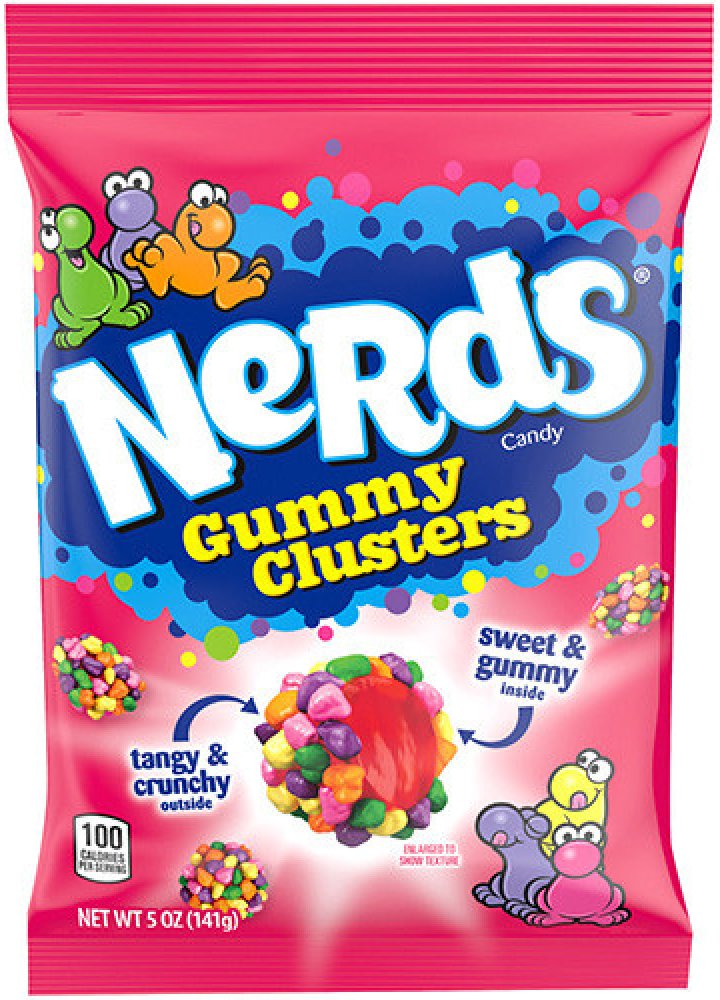 Nerds bonbónky želé uvnitř, křupinky na povrchu, s příchutí Složení: cukr, gumová báze, kukuřičný sirup, obsahuje méně než 2%: kyselina jablečná, regulátory kyselosti (kyselina citronová, citronany sodné), přírodní a umělé aroma, koncentrát jablečné šťávy, zahušťovadlo (arabská guma), glazura (karnaubský vosk), barvivo E120, E133, CI potravinářská modř Energetická hodnota na 100g Energie 1350 kJ...