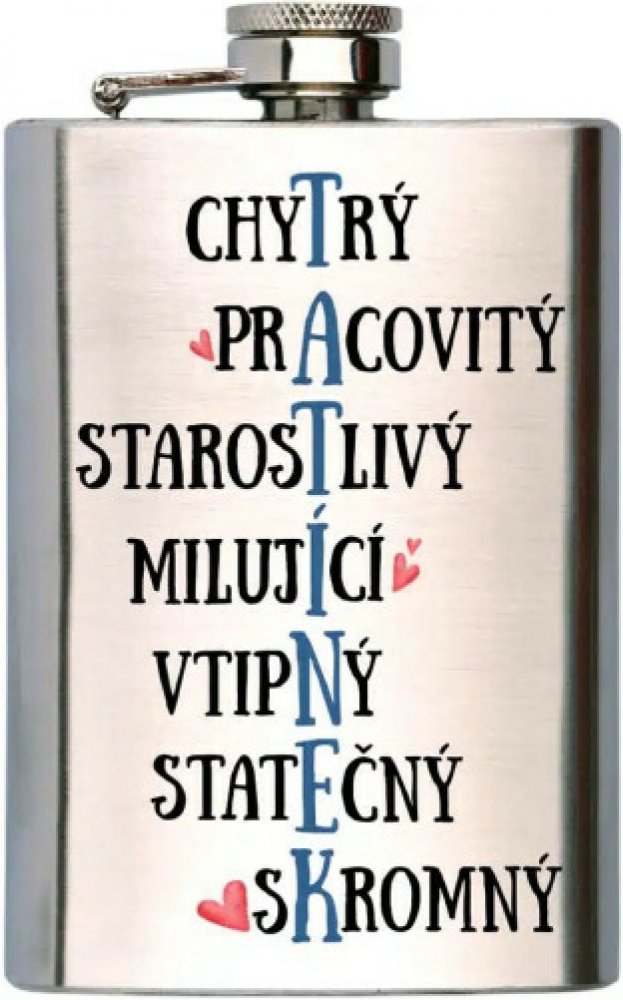 Nerezová placatka na alkohol se šroubovacím uzávěrem vám pomůže vyléčit neduhy nebo zahnat zimu. Placatice má potisk s motivem pro tatínka – Super táta. Originální dárek pro tatínka k narozeninám, k svátku, pro radost nebo k VánocůmObjem placatky je 200 ml.