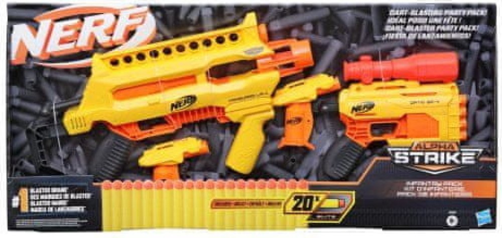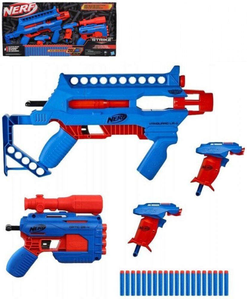 Velký herní set Nerf Alpha Strike. Součástí je dětská plastová zbraň blaster 4x + pěnové soft náboje (šipky) 20ks. Modro-oranžové provedení.