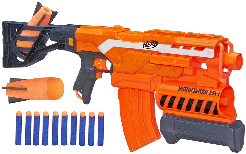S puškou Demolisher 2v1 můžete na cíl střílet dva typy munice! Tato puška bude mít největší sílu, až budete střílet velkými raketami vystřelovanými tlakem až 27 m daleko! Nebo vypustíte příval šipek automatickou palbou. Pokud chcete ohromit kamarády, můžete střílet obojí najednou! Rakety si uložte do odnímatelného zásobníku. S puškou Demolisher 2v1 bude každé vítězství jen Vaše!Obsahuje 10 šipek a 2 rakety.Baterie 4 x AA nejsou součástí, obj. č. 214000.Délka šipky cca 7 cm a délka rakety cca 12 cm.Rozměr krabice cca 30,5 x 64,5 x 8 cm (V x Š x H).