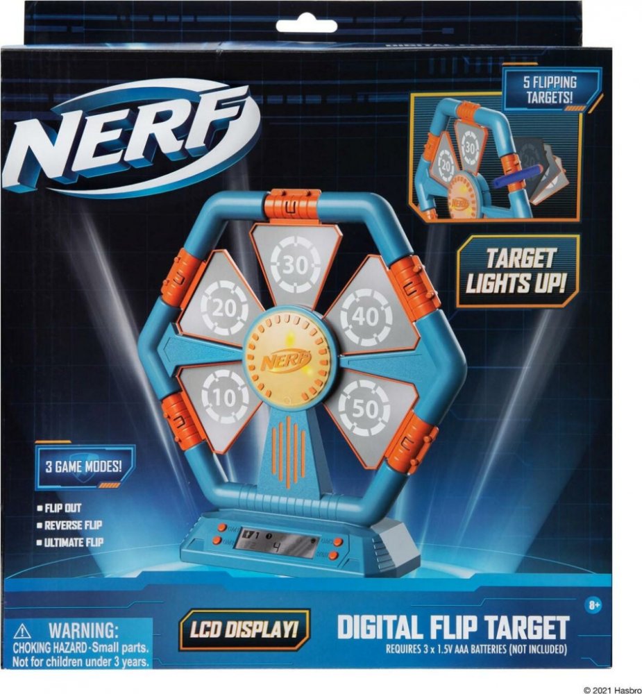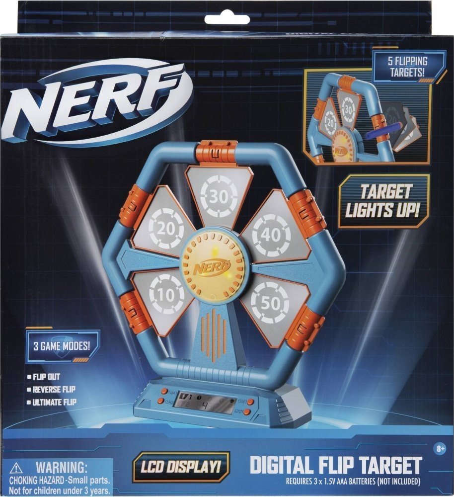 Otestujte si svou mušku! Na digitálním terči NERF je 6 zásahových zón: 5 rotujících cílů (za 10, 20, 30, 40, 50 bodů) a střed terče za 100 bodů. Možnost výběru ze 3 herních režimů. LCD displej zobrazuje herní režim, čas a získané body. Můžete hrát sólo nebo ve dvojici.Sada neobsahuje šipky.Vyžaduje 3 baterie AAA (nejsou součástí balení)Doporučený věk: 8+Nerf Digitální sklápěcí terč - video: