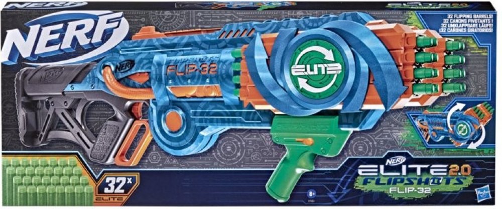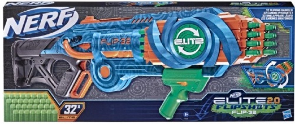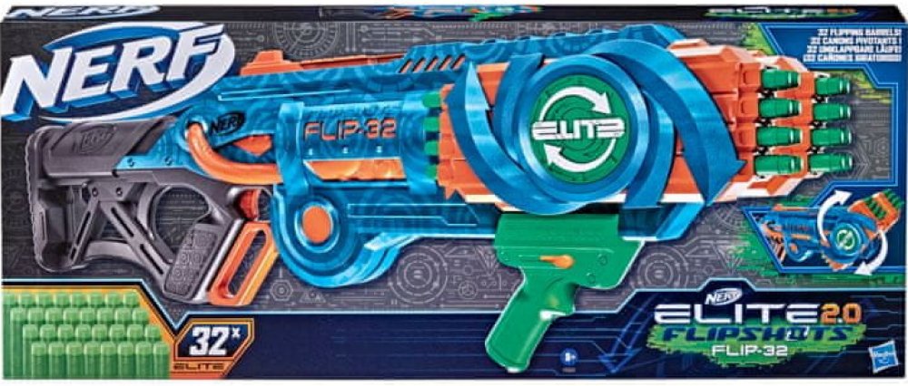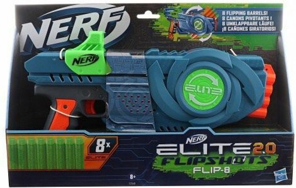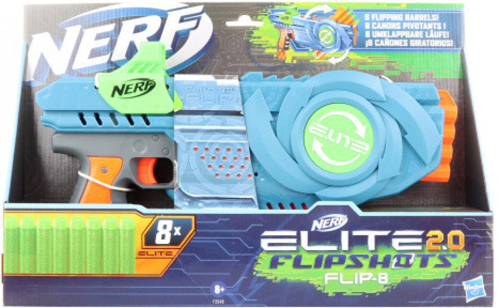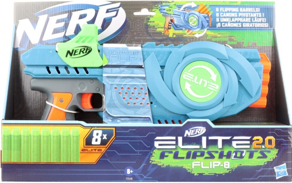NERF Elite 2.0 Flipshoty přidávají do bitev zábavu. Narušují strategii soupeře tím, že ho nutí myslet si, že máte jen jednu hlaveň. Když vystřelíte čtyři šipky z první hlavně, jednoduše zatlačte na integrované mířidlo NERF Elite Flip-8 a otočíte druhou hlaveň naplněnou čtyřmi šipkami. Pro nabití blasteru jednoduše zatáhněte za rukojeť dolů. Tento blaster, nabitý osmi šipkami NERF Elite, vystřeluje vždy jednu šipku, takže máte k dispozici dvě hlavně po čtyřech šipkách. Věk 8+