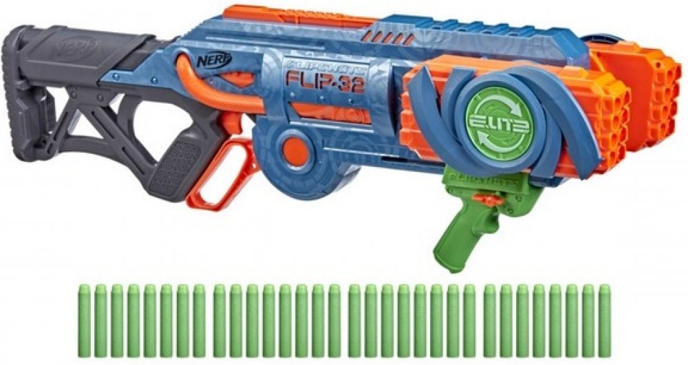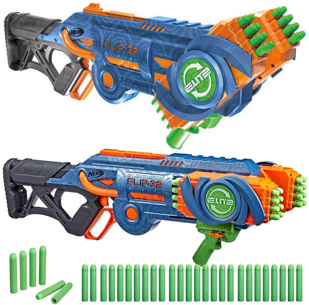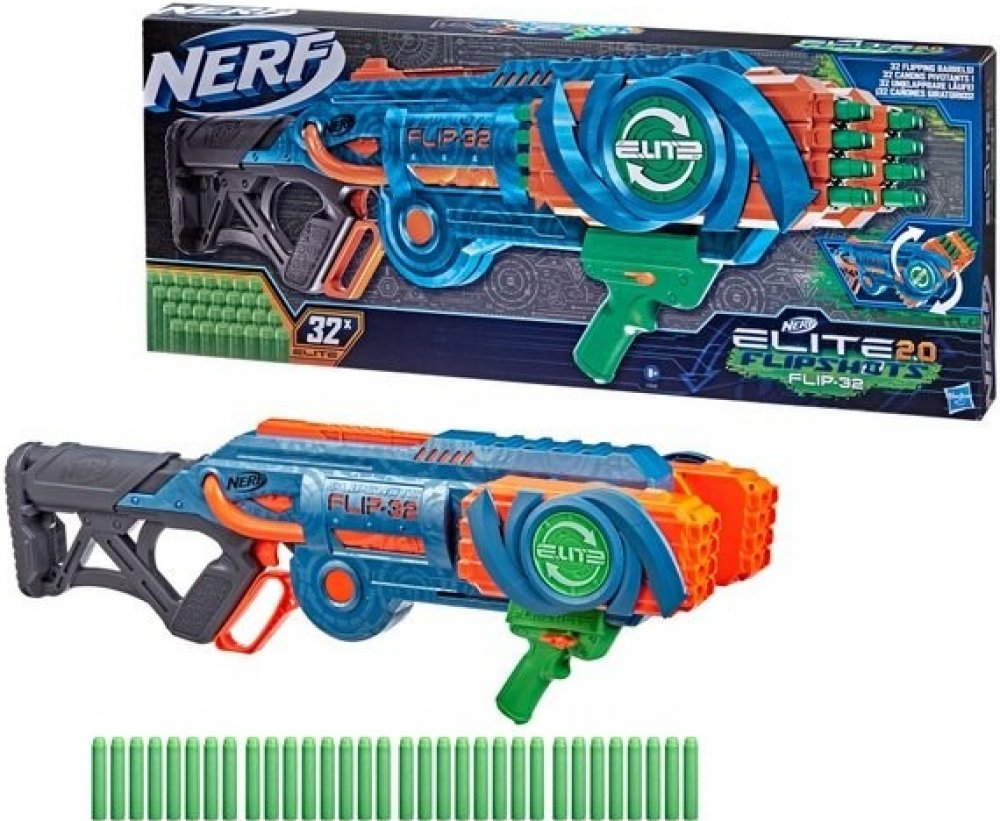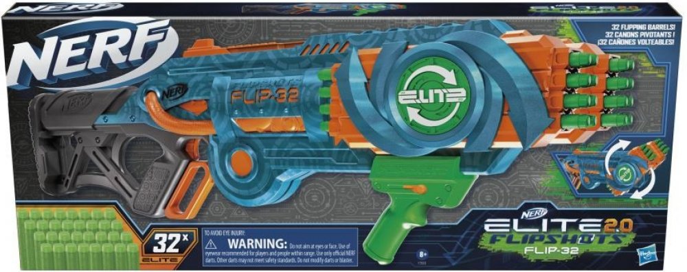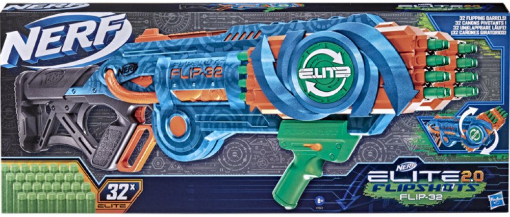 NERF Elite 2.0 Flipshoty přidávají do bitev zábavu. Narušují strategii soupeře tím, že ho nutí myslet si, že máte jen jednu hlaveň. Když vystřelíte čtyři šipky z první hlavně, jednoduše zatlačte na integrované mířidlo NERF Elite Flip-8 a otočíte druhou hlaveň naplněnou čtyřmi šipkami. Pro nabití blasteru jednoduše zatáhněte za rukojeť dolů. Tento blaster, nabitý osmi šipkami NERF Elite, vystřeluje vždy jednu šipku, takže máte k dispozici dvě hlavně po čtyřech šipkách. Věk 8+