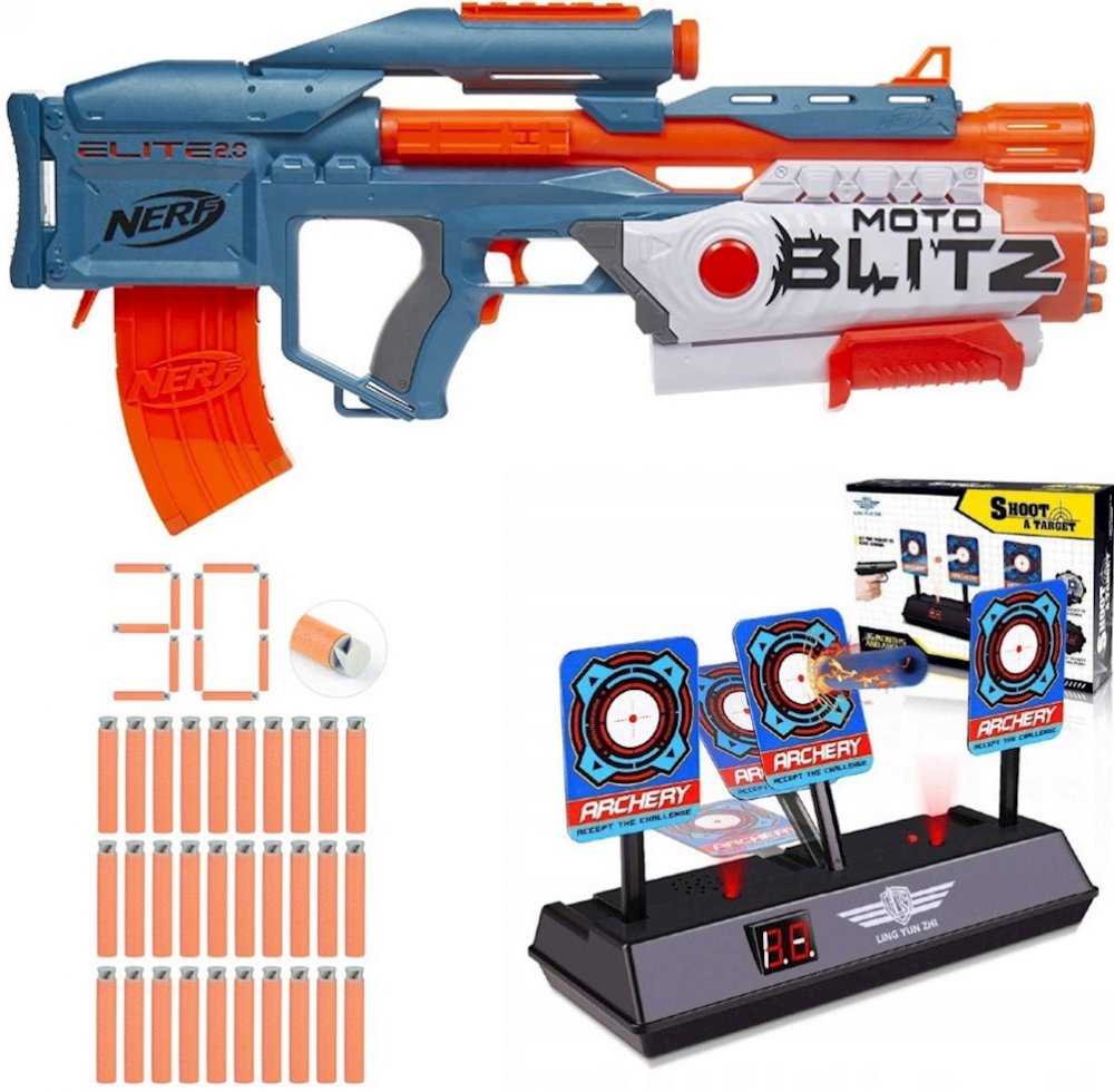 NERF ELITE 2.0 MOTOBLITZ F5872 + ELEKTRONICKÝ TERČ + 30 ŠIPEK ACCUSTRIKE