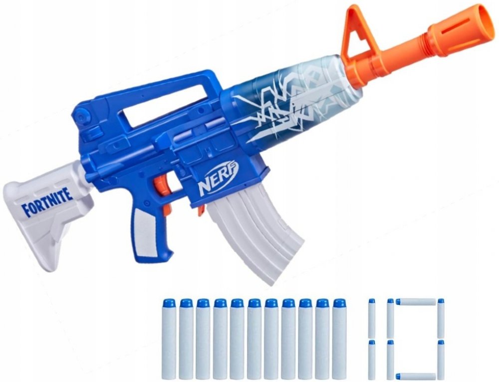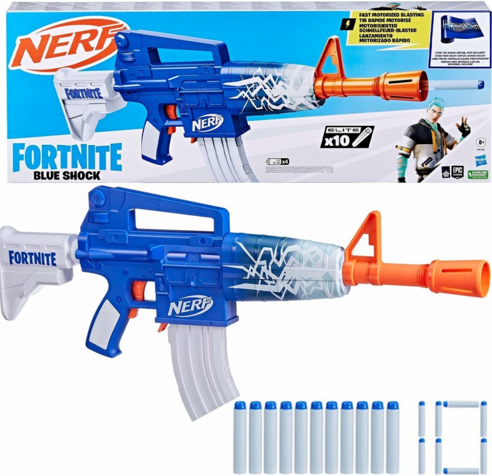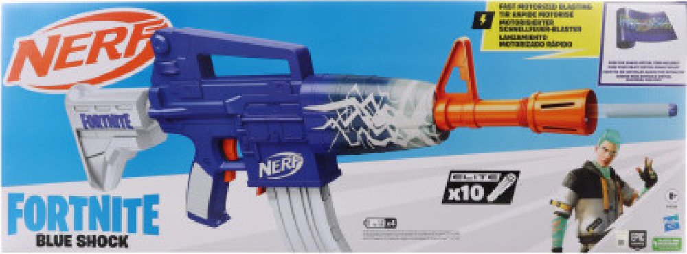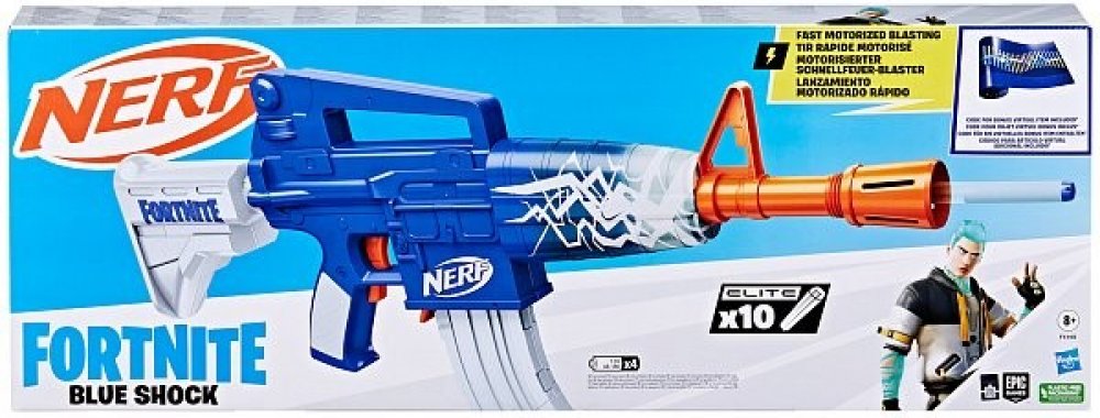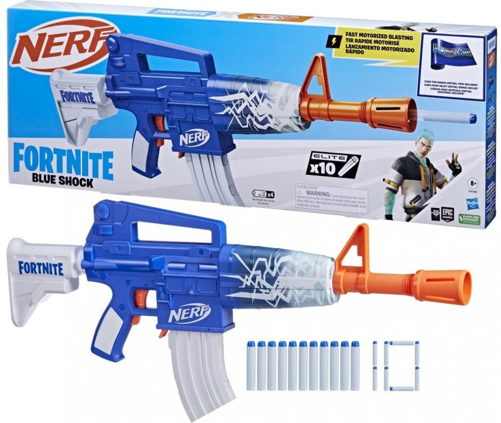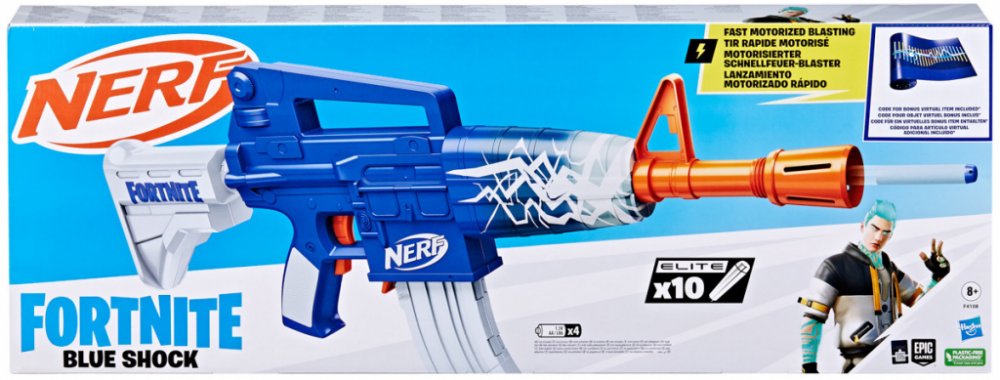 S dětskou pistolí Nerf Fortnite Blue Shock od společnosti Hasbro si všichni užijí ohromnou hromadu zábavy. Pro dobíjení je k dispozici 10 pěnových šipek Nerf, které se pyšní dlouhým dostřelem.Blaster má navíc velký hledáček, pomocí kterého hravě najdete vašeho nepřítele. Zatáhněte za nabíjecí páčku a budete připraveni střílet. Součástí je zásobník do kterého se vejde 10 nábojů. Hračka je vyrobena z kvalitního plastu v barvě bílá-modrá. Blastr je inspirovaný výstrojí populární videohry Fortnite. Obsahuje bonusový kód do hry Fortnite. Při hraní je doporučeno, aby děti použily bezpečnostní brýle (nejsou součástí). Funguje na 4x AA baterie, které nejsou součástí. Rozměr balení: 27,9 x 76,2 x 6,7 cm. Vhodné od 8 let.