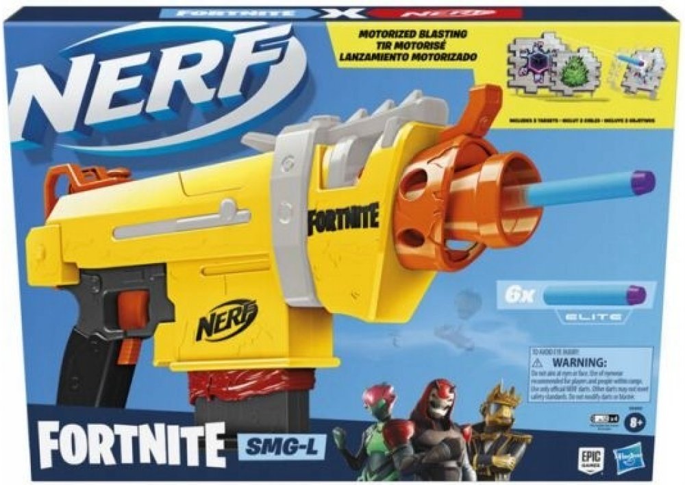 Motorizovaný vrhač SMG-L, inspirovaný těmi, které používají ve Fortnite, zachycuje vzhled toho z oblíbené videohry, od barevného provedení až po hroty, železný zaměřovač a mnoho dalších detailů. Obsahuje 3 volně stojící terče zdobené spreji z videohry. Sada obsahuje 6 šipek ELITE. Napájení 4x1,5V AA bateriemi (nejsou součástí balení).