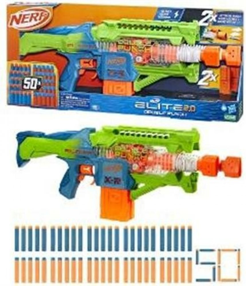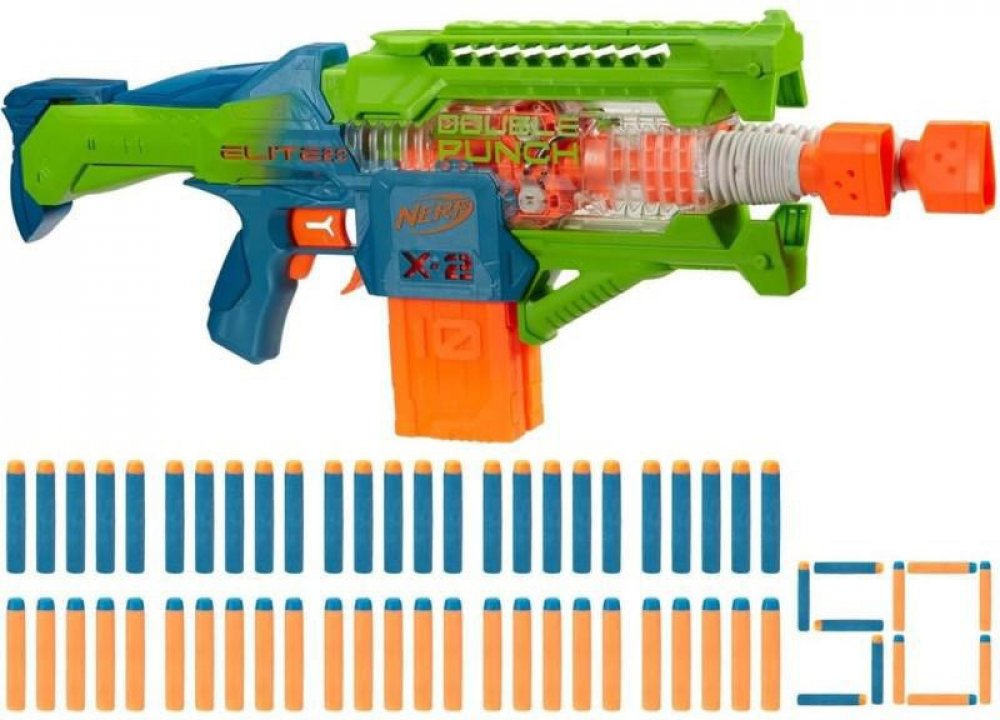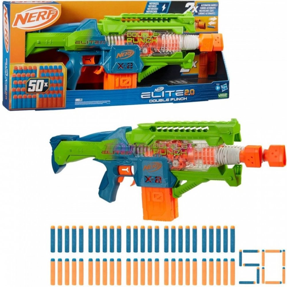 Zdvojnásobte radost ze střílení šipek s blástrem Nerf Elite 2.0 Double Punch! Tento motorizovaný blástr má totiž 2 hlavně a 2 zásobníky! Blástr Double Punch se může chlubit dvěma rychle se střídajícími hlavněmi, které se při střelbě pohybují dopředu a zpět. Součástí jsou 2 zásobníky po 10 šipkách, takže to můžete rozjet se 20 šipkami v řadě. V balení naleznete hned 50 pěnových šipek Nerf Elite 2.0, takže máte dostatečné množství, abyste naplnili oba zásobníky po 10 kusech a další šipky připravili do úložného prostoru a měli je tak po ruce pro další nabíjení. Šipky jsou dodávány ve 2 různých barevných provedeních. Užijte si akce na plné obrátky díky motorizované střelbě. Stačí držet stlačené akcelerační tlačítko a při stisknutí spouště pak spustíte rychlou palbu. Děti budou nadšené – šipky rychle létají, hlaveň se pohybuje dopředu a zpět a hry venku díky tomu získají šťávu. Je to skvělý dárek pro děti a perfektní hračka, při které budou děti v pohybu. Při hraní se doporučují brýle (nejsou součástí balení). Je zapotřebí 4× 1,5 V alkalických AA baterií (nejsou součástí balení).