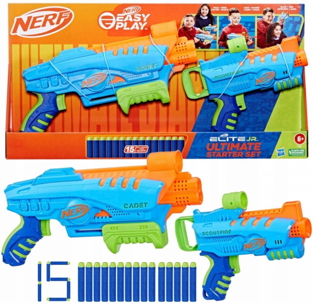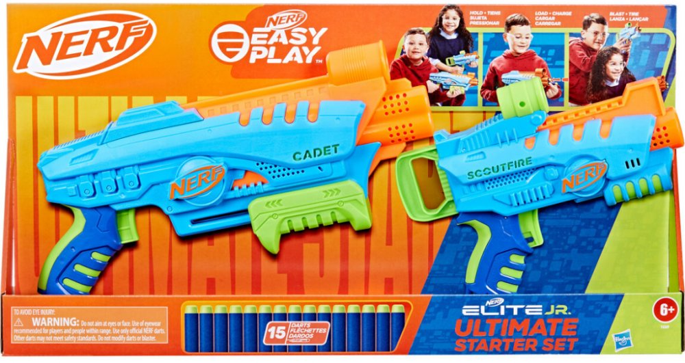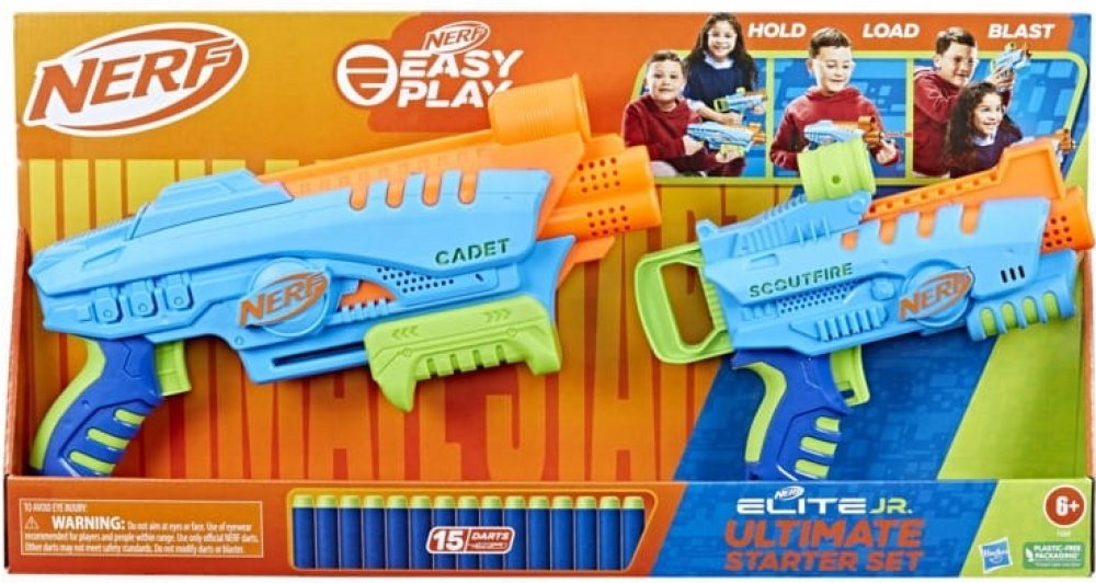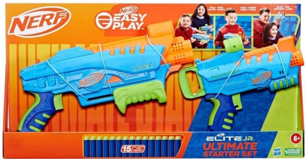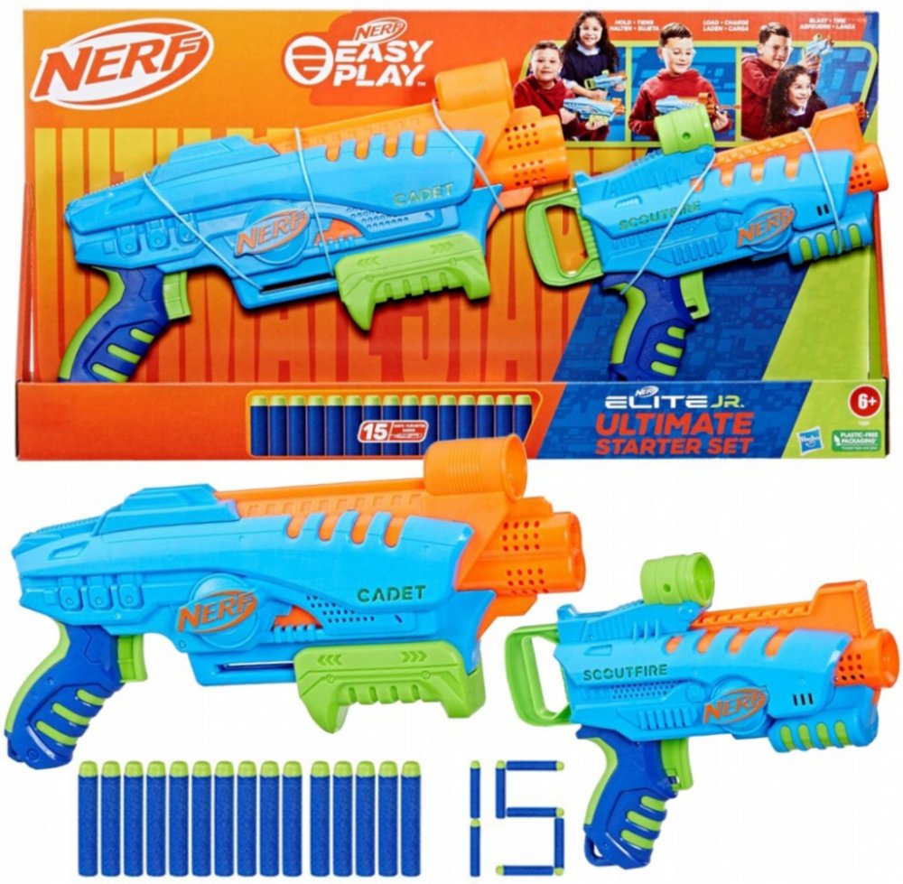 Snadno použitelné pěnové blastery Nerf Elite Junior jsou určeny pro chlapce a dívky, kteří se poprvé pouštějí do bitev Nerf. Díky speciálním funkcím se s nimi snadno hraje, takže děti budou hrát vzrušující hry s hračkami Nerf během okamžiku. Mohou se pustit do energií nabité hry se šipkami uvnitř i venku a a zažít vzrušení z toho, že to všechno zvládnou samy. Blastery se snadno drží, mají takovou velikost, aby se pohodlně vešly do malých rukou, a jsou lehké pro snadné přenášení při dětských venkovních hrách. Konstrukce s předním plněním usnadňuje vkládání šipek. Střílení je usnadněno rukojetí mající nejnižší tažnou sílu ze všech šipkových blasterů Nerf. Všechny tyto funkce umožňují dětem dostat se do rychlé akce a mohou ukázat své střelecké dovednosti, protože každý krok dělají samy! Snadno použitelná sada Nerf Elite Junior Ultimate Starter Set obsahuje 2 blastery na pěnové šipky, 2 terče a 15 pěnových šipek Nerf Elite.