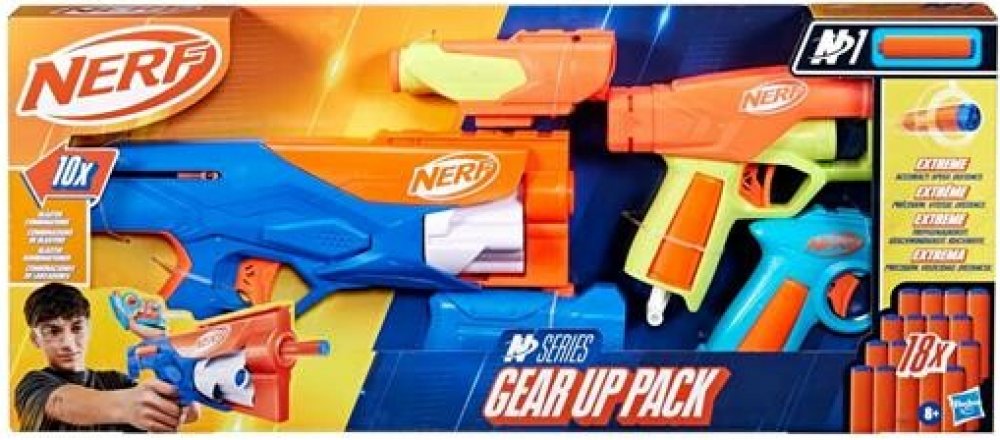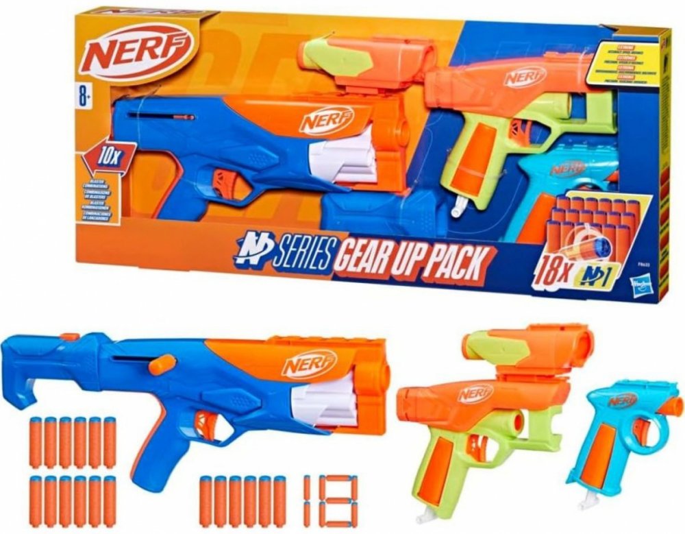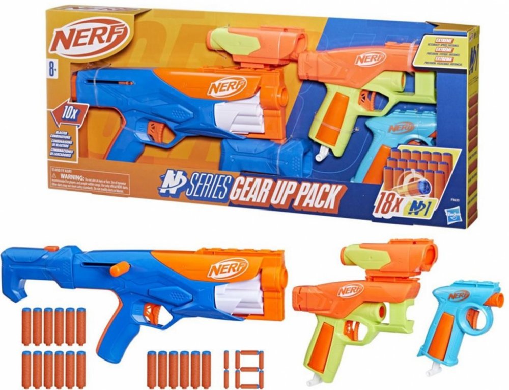 Hasbro Nerf N Series Gear Up Pack nabídne akční zábavu s různými možnostmi sestavení a hraní. Sada obsahuje 3 různé pistole (blastery), 18 šipek a vyměnitelný zaměřovač a pažbu, což umožňuje kombinovat jednotlivé díly a přizpůsobit si zbraň podle stylu boje.