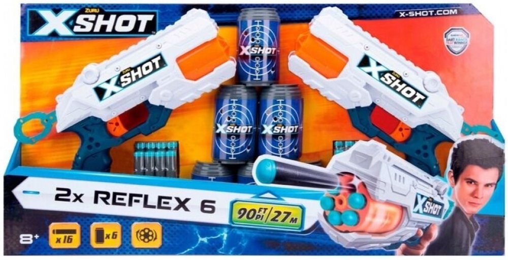 Vyzvěte přítele na trénink na terč s X-Shot Excel Reflex TK-6 Combo od Zuru. 2 revolvery v Zuru X-Shot Excel Reflex TK-6 Combo jsou dodávány se 3 terčovými boxy a 16 šipkami nebo s 36 šipkami (k dispozici různé sady). Pistole mají otočné bubny a mají dostřel 27 metrů.