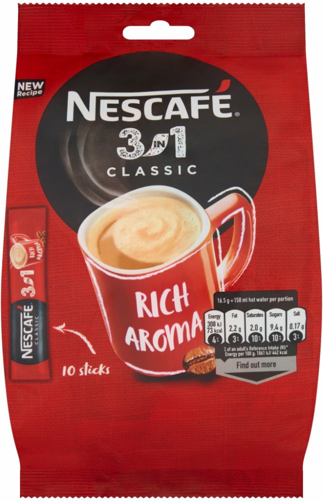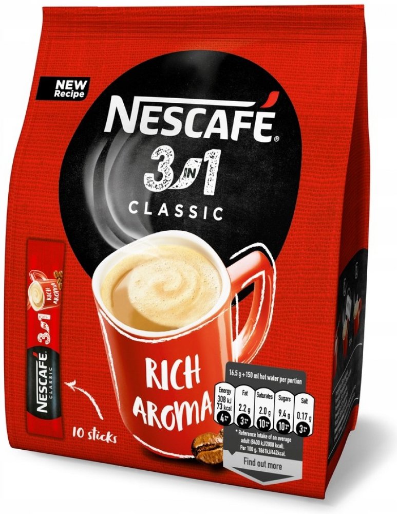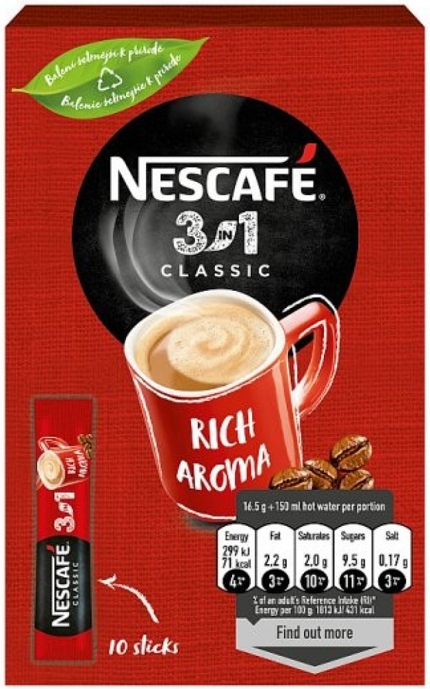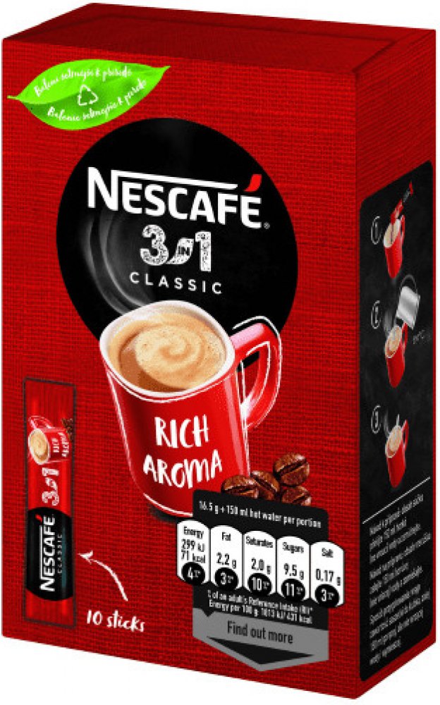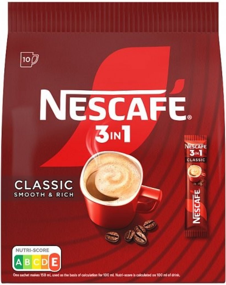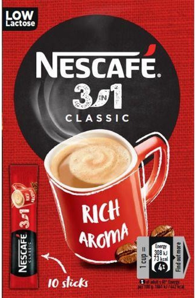 Objevte chuť kávy NESCAFÉ® 3v1 Classic – dokonalou harmonii kávy s cukrem a jemně mléčnou chutí. Základem NESCAFÉ® 3v1 jsou pečlivě vybrané, odborně středně pražené směsi vysoko kvalitních kávových zrn Robusta. Dokonale vyvážený poměr ingrediencí zaistí, že během chvilky získáte lahodně bohatý šálek kávy s výraznou aromou.