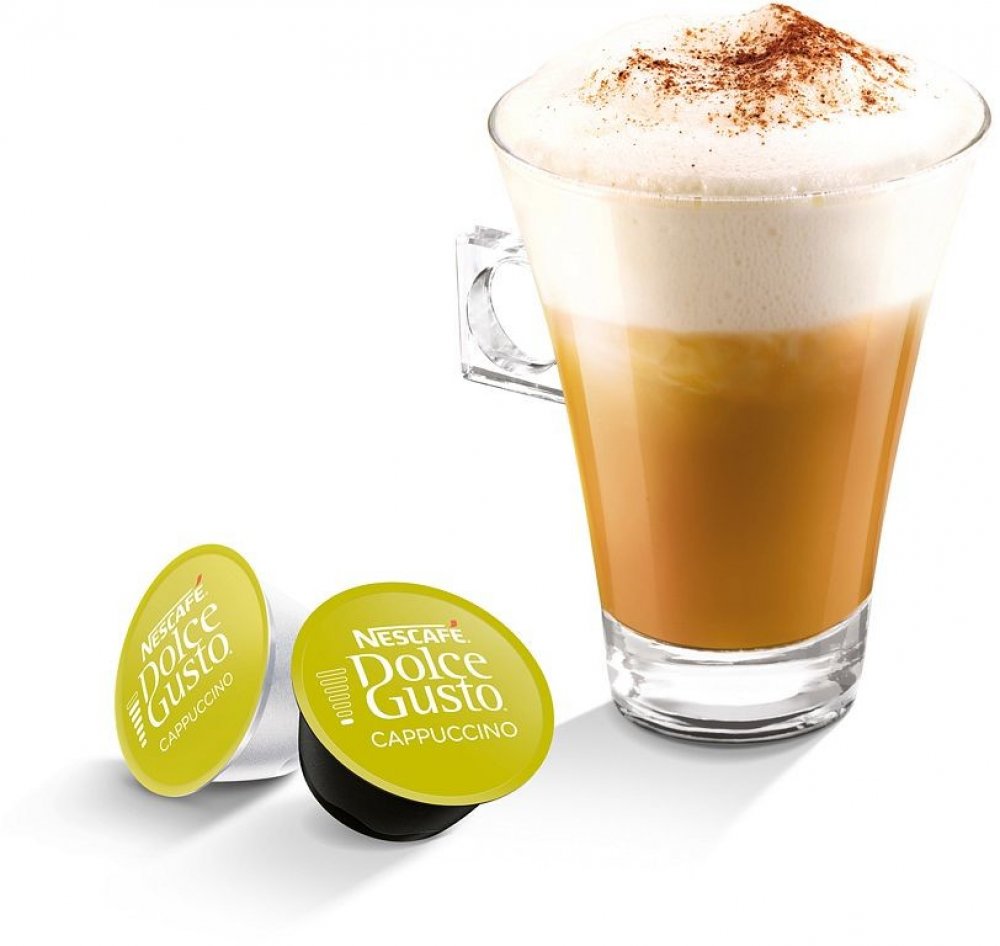 Objevte italskou ikonu NESCAFÉ® Dolce Gusto® Cappuccino. Bohaté, silné aroma intenzivního espressa kombinuje s jemnou chutí a smetanovou texturou mléčné cremy.Naši talentovaní tvůrci dovedli dvoukapslový recept NESCAFÉ® Dolce Gusto® Cappuccino k dokonalosti: jedna kapsle je pro espresso – italská tmavě pražená směs 100% jihoamerické kávy arabika – a jedna na mléko s trochou cukru. PRVOTŘÍDNÍ KÁVAPro kávová zrna, ze kterých se vyrábí nápoje NESCAFÉ® Dolce Gusto®, putujeme do všech koutů světa od Brazílie, Kolumbie, Etiopie až po Vietnam a mnoho dalších zemí. ESPRESSO DO MINUTYS kávovary NESCAFÉ Dolce Gusto si vychutnáte perfektní espresso do jedné minuty. Díky profesionálnímu tlaku našich kávovarů si můžete připravit kávu profesionální kvality s hustou sametovou cremou. OCHRANA ČERSTVOSTI A AROMATUUnikátní kávová kapsle je navržena tak, aby ve spojení s kávovarem NESCAFÉ® Dolce Gusto® zajistila dokonalý zážitek z každého šálku. Aroma a chuť kávy jsou hermeticky uzavřeny v každé kapsli, zůstávají tak uchovanány v neměnné kvalitě, pro přípravu vašeho bezchybného šálku. PŘES 30 KÁVOVÝCH KREACÍS NESCAFÉ® Dolce Gusto® si můžete vychutnat více než 30 druhů nápojů. Vybírat můžete z několika variant prémiové černé a bílé kávy. Ochutnejte bohaté ristretto, intenzivní espresso, aromatické lungo, krémové cappuccino, jemné latte macchiato, čaj a lahodné čokoládové nebo osvěžující studené nápoje. SNADNÁ PŘÍPRAVAJednoduše vložíte kapsli do svého kávovaru NESCAFÉ® Dolce Gusto® a vzápětí tu máte skvělý nápoj. Podrobný návod k použití systému NESCAFÉ® Dolce Gusto® je ke stažení na www.dolce-gusto.cz. Balení obsahuje 16 kapslí navržených pro kávovary NESCAFÉ® Dolce Gusto®, pomocí nichž si můžete připravit 8 šálků.. Složení: Složení bílé kapsle: sušené plnotučné mléko (82,4 %), cukr (17,6 %). Může obsahovat sóju.Složení černé kapsle: pražená mletá káva. Baleno v ochranné atmosféře.
