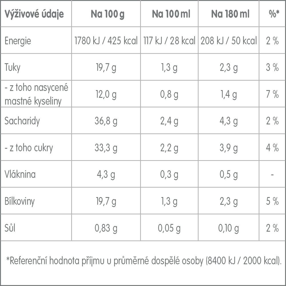 - Plnotučné mléko (73,7 %) – bez náhražek