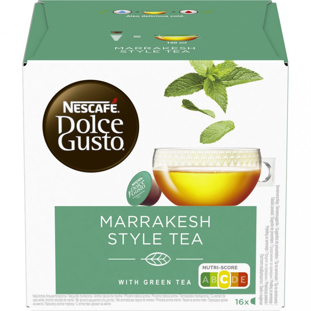 Kávové kapsle Nescafé Dolce Gusto Marrakesh Tea 16ks: Lahodný nápoj Nescafé Dolce Gusto Marrakesh Tea nabízí nezaměnitelné aroma výtečného mátového čaje. Tento sladký nápoj je tradičním nápojem v prosluněném Maroku. Výrazná chuť máty v létě osvěží, v zimě v horkém nápoji zahřeje. Příprava je tak jednoduchá - skrze kapsl...