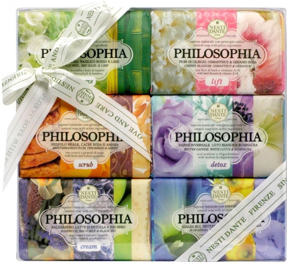 Dárková sada šesti luxusních přírodních italských mýdel řady Philosophia. Relaxační a očišťující řada mýdel s aktivnímí složkami Nesti Dante Philosophia obsahuje: