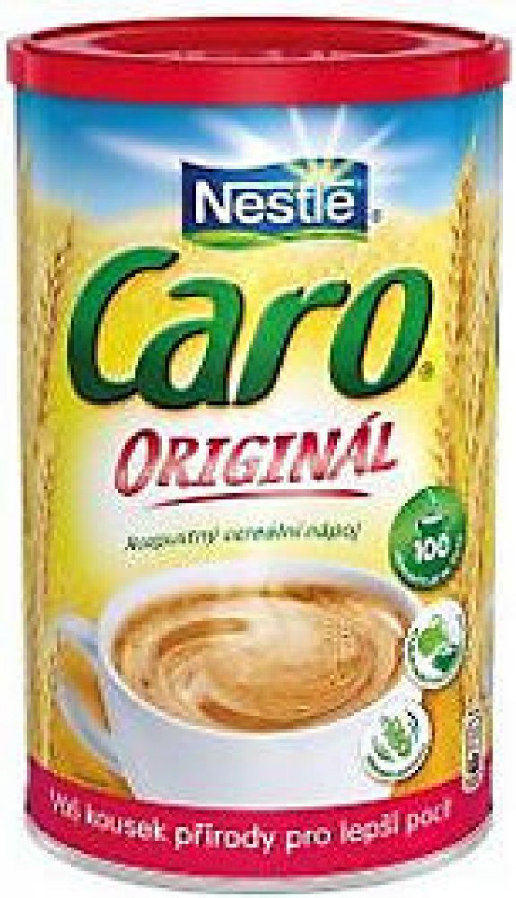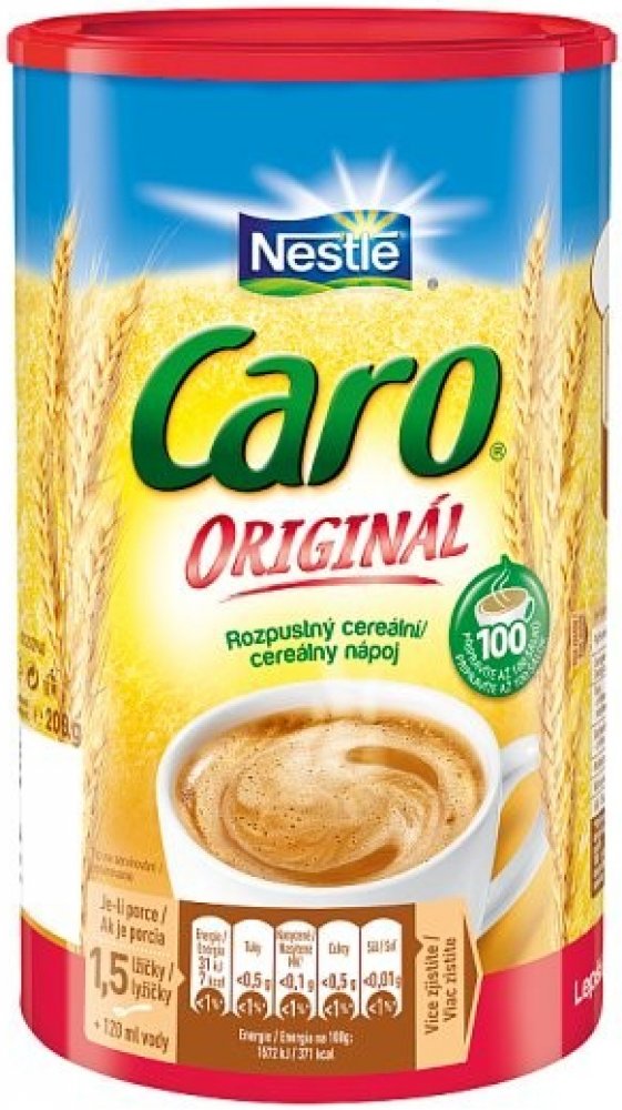 Rozpustný cereální nápoj.Nestlé Caro je bez přídavku cukru, obsahuje přirozeně se vyskytující cukry. Rozpustná směs kávovin. Složení: Ječmen, slad z ječmene, čekanka, žito. Může obsahovat stopy mléka. Alergeny jsou označeny tučným písmem. Výživové hodnoty na 100g / na porci: Energetická hodnota 1572 kJ 126 kJ 371 kcal 39 kcal 2 %* Tuky