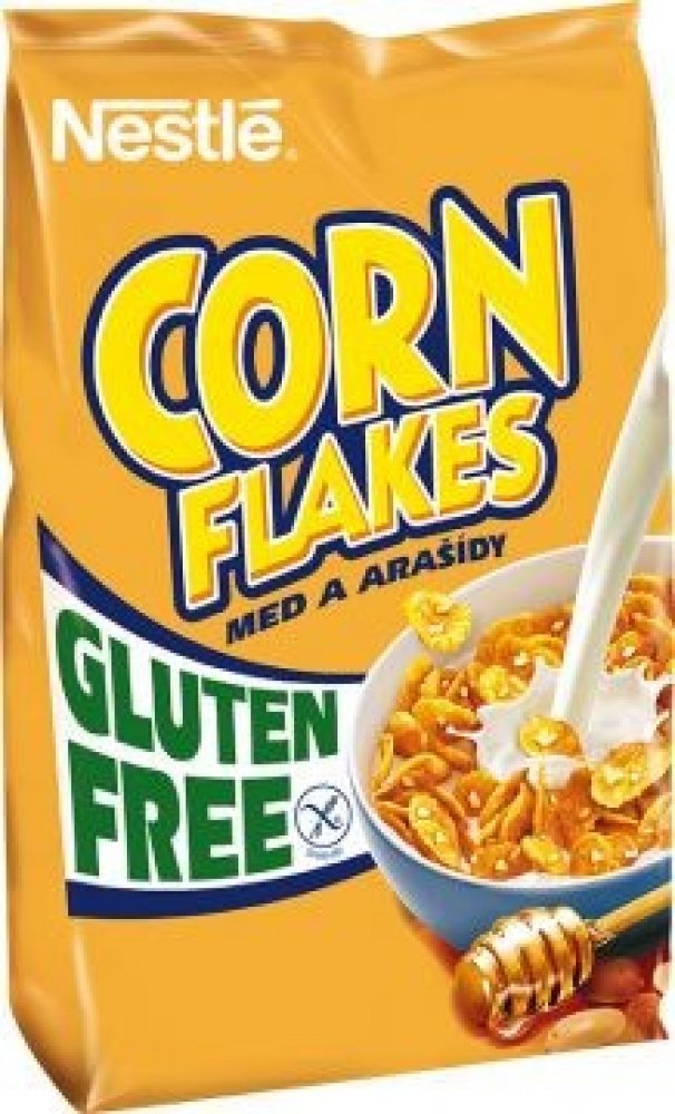 Nestlé cereálie CORN FLAKES Med a arašídy jsou bezlepkové křupavé kukuřičné lupínky obalené medem a arašídy. Obsahují pět vitamínů. Představují snídaňovou variantu vhodnou pro celou rodinu.
