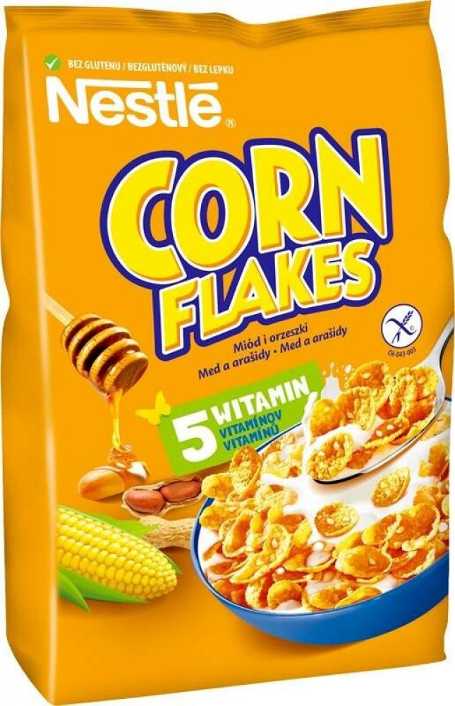 Kukuřičná krupice 70,1 %, cukr, ARAŠÍDY 7,5 %, oligofruktóza, med 2 %, jedlá sůl. Sirup z invertního cukru, melasa, antioxidant (extrakt s vysokým obsahem tokoferolů, vitamíny [nikotinamid (niacin). D-pantothenát vápenatý (kyselina pantothenová), riboflavin (vitamin b2). Pyridoxin-hydrochlorid (vitamin b6), kyselina pteroymonoglutamoná (kyselina listová)], % - vztaženo na ...