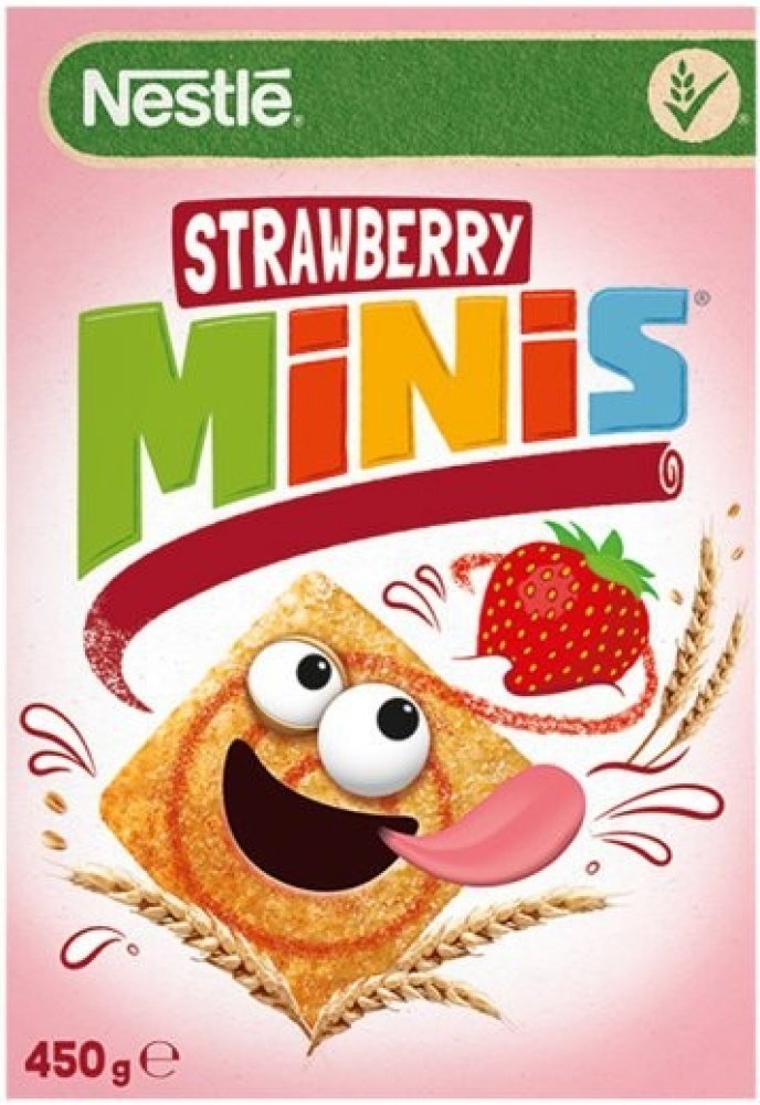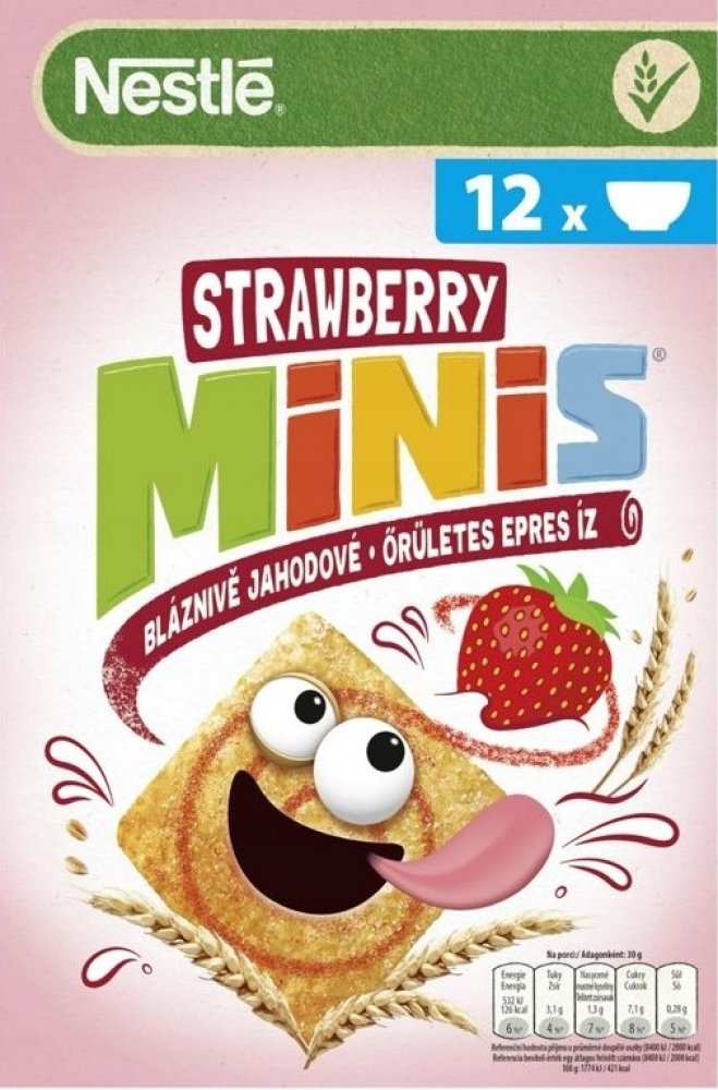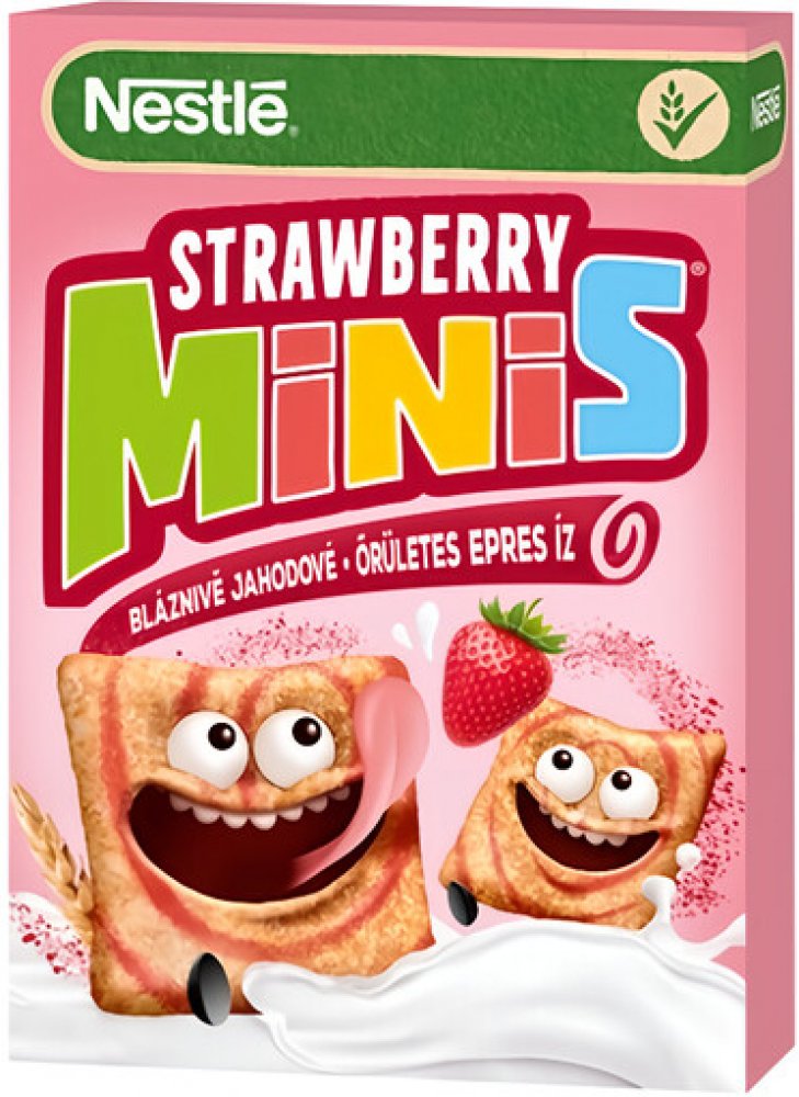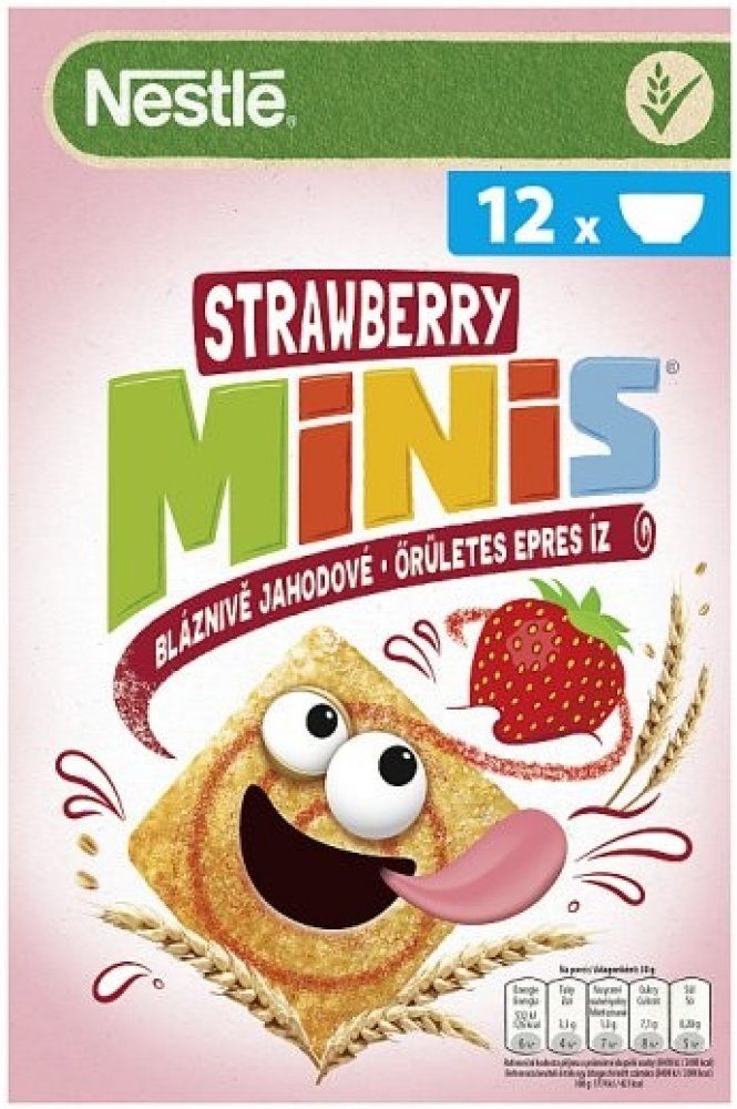 Cereální čtverečky s chutí jahod.Strawberry Minis jsou bláznivě jahodové cereální čtverečky, které obsahují celozrnné cereálie, vitamíny a minerální látky.Se snídaňovými cereáliemi Nestlé se můžete Vy i celá Vaše rodina těšit z jejich výborné chuti a zároveň dostáváte to nejlepší z celého zrna.