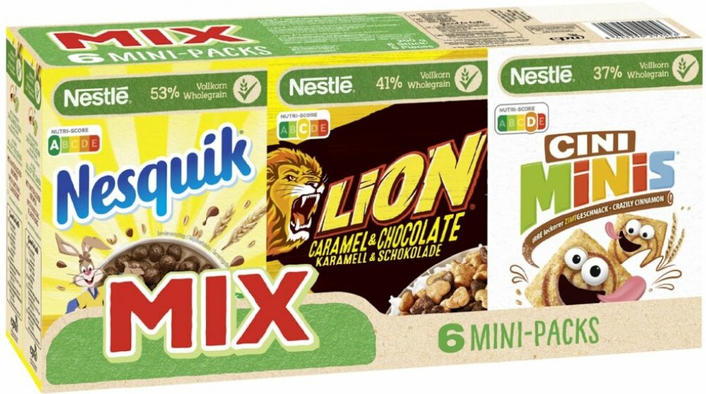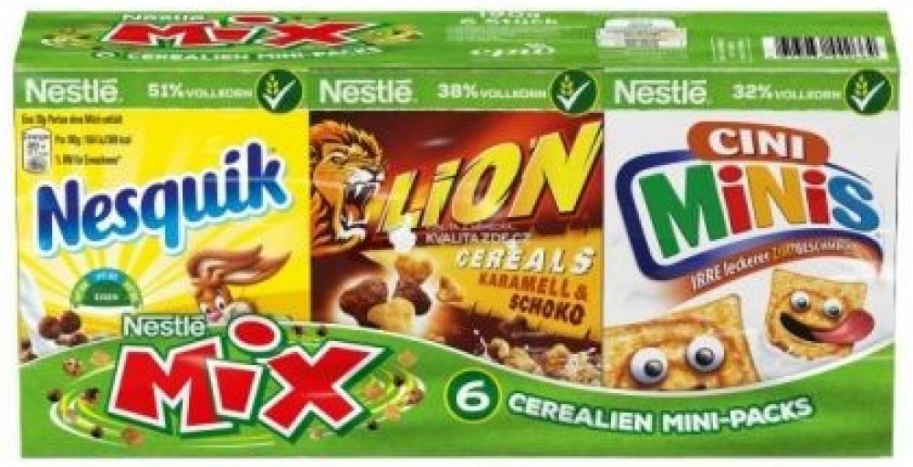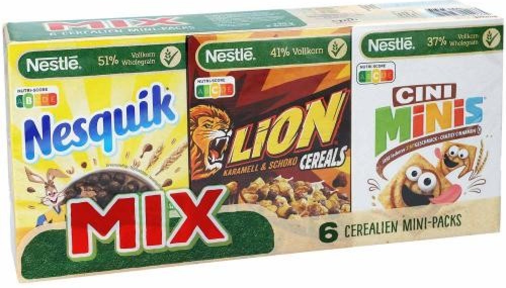 2 × Nesquik: pražené cereálie s kakaem2 × Cini Minis: snídaňové cereálie vyrobené z celozrnných cereálií se skořicí1 × Lion cereálie: pražené cereálie s karamelovým krémem a čokoládou1 × Crisp Crisp: pražené cereálie s kousky čokoládových sušenek