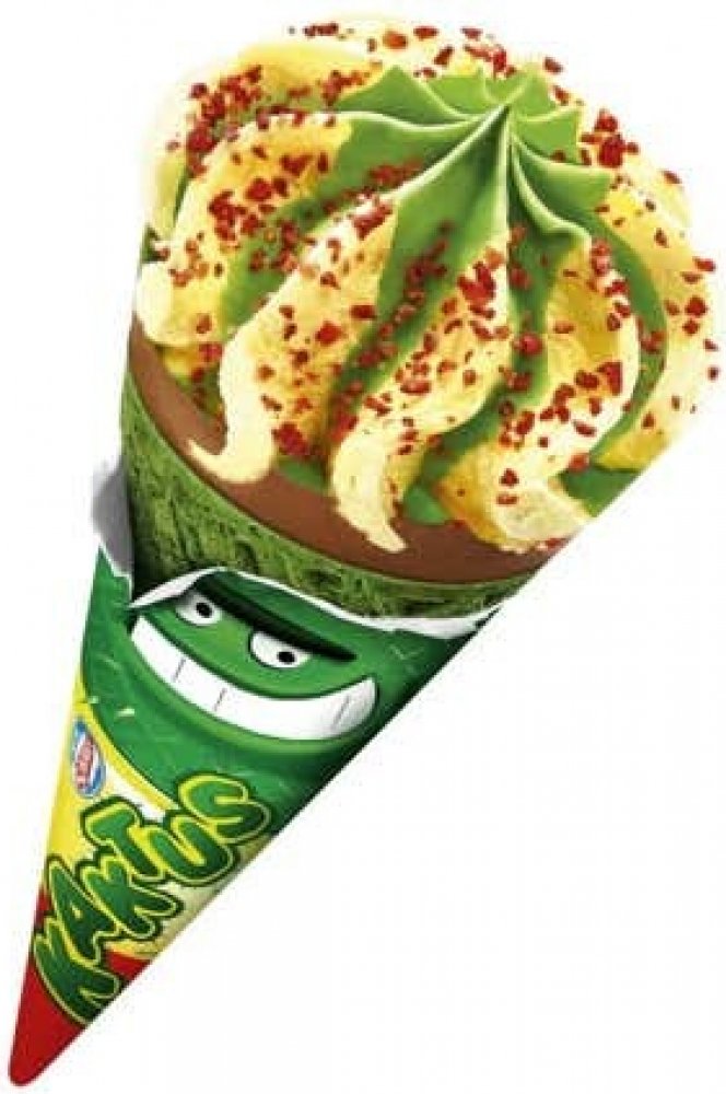 Mražený krém citronový a vodový mražený krém jahodový se zelenou tukovou polevou (7,1%) a kousky sušených jahod. Lehká smetanová kaktusová zmrzlina s lahodnými křupinkami v zeleném kornoutu s čokoládou.