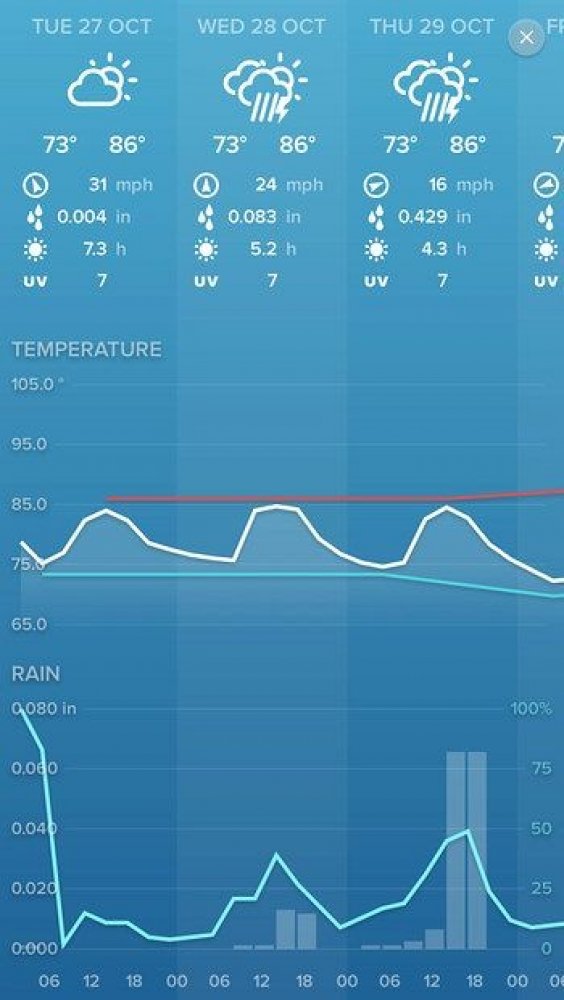 Součástí aplikace je také předpověď počasí na následujících 7 dnů a v případě větších měst i informace o znečištění prostředí.