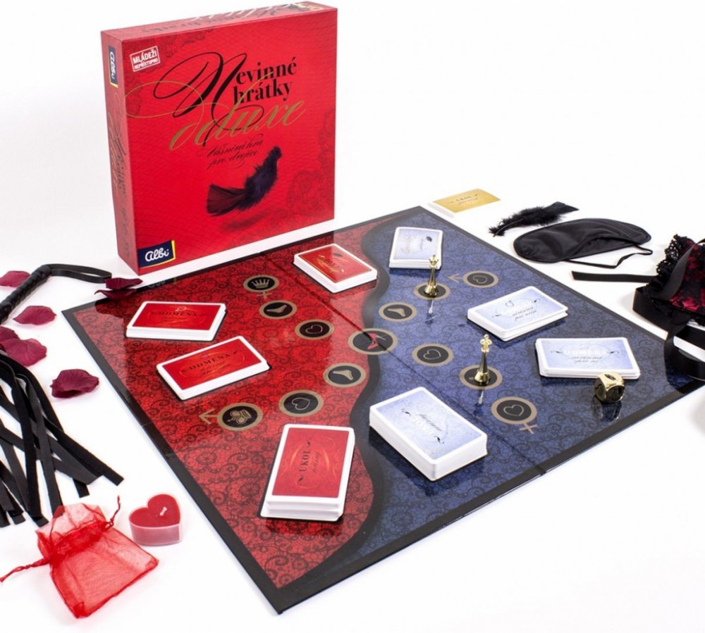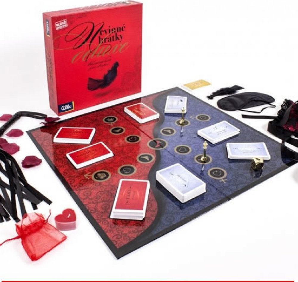 Hra pro dospělé obsahuje: 252 karet, herní plán, originální zlatou figurku pro muže, originální zlatou figurku pro ženu, zlatou kostku, pouta, škrabošku, bičík, svíčku, peříčko, růžové lístky a pravidla.