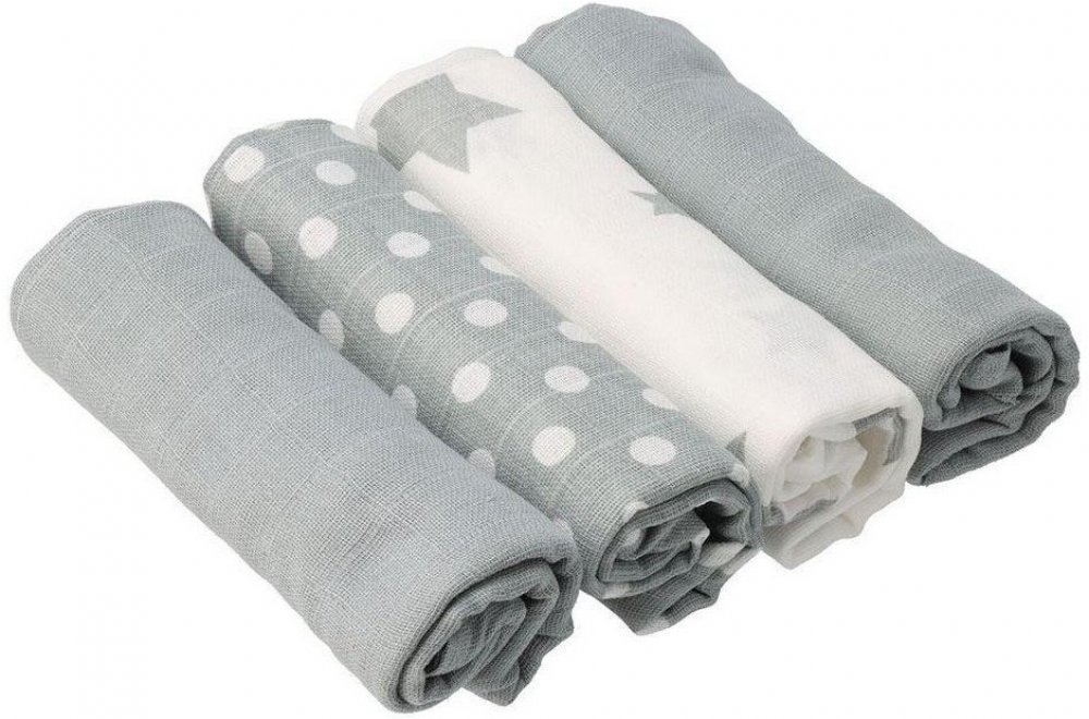 Výrobek splňuje požadavky plynoucí z vyhlášky č. 84/2001 Sb. o hygienických požadavcích na hračky a výrobky pro děti ve věku do 3 let. Testováno v ČR.Charakteristika:- balení: 4 ks v kartonu- rozměr pleny: 70 x 70 cm- složení: 100% bavlna, gramáž 120 g/m2, dvouvrstvá.- barva: 1x šedá s bílými puntíky, 1x bílá s šedými hvězdičky, 2x šedá