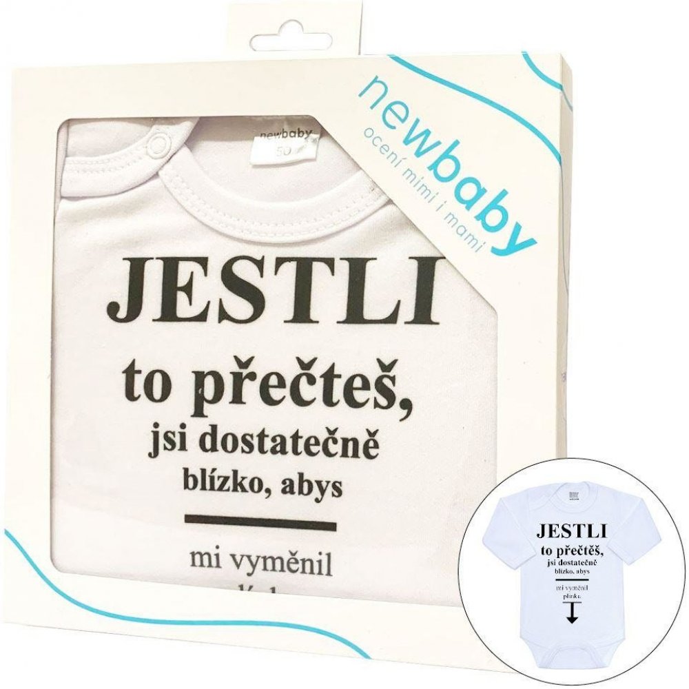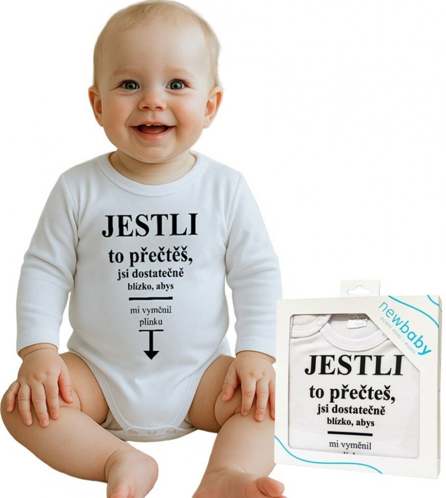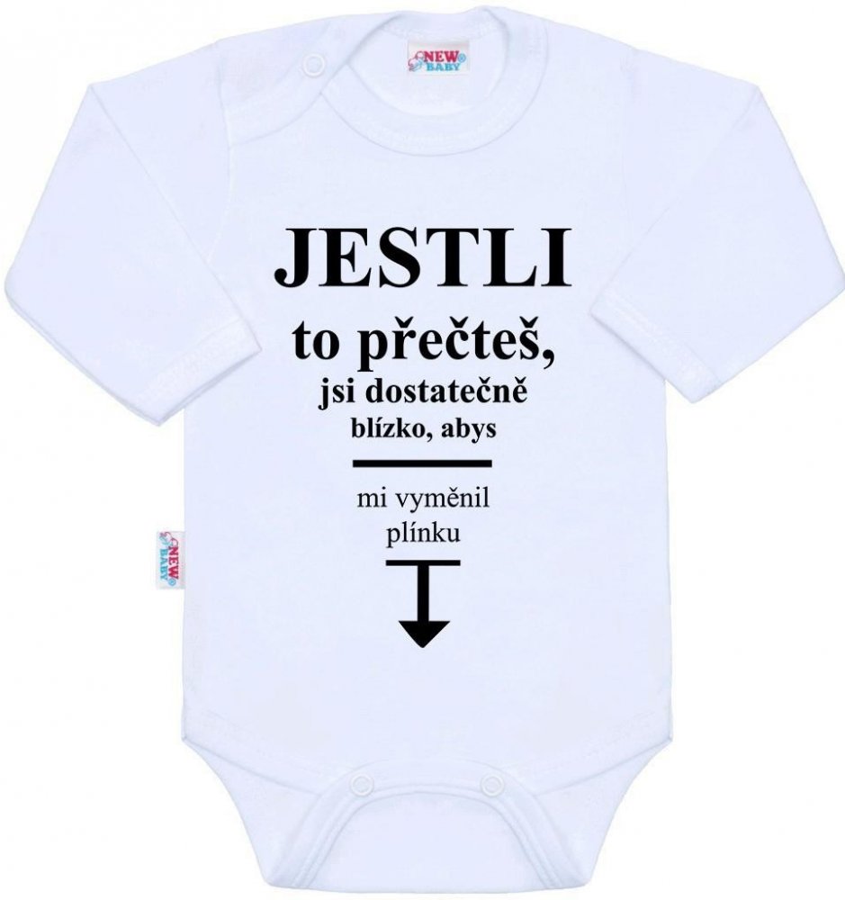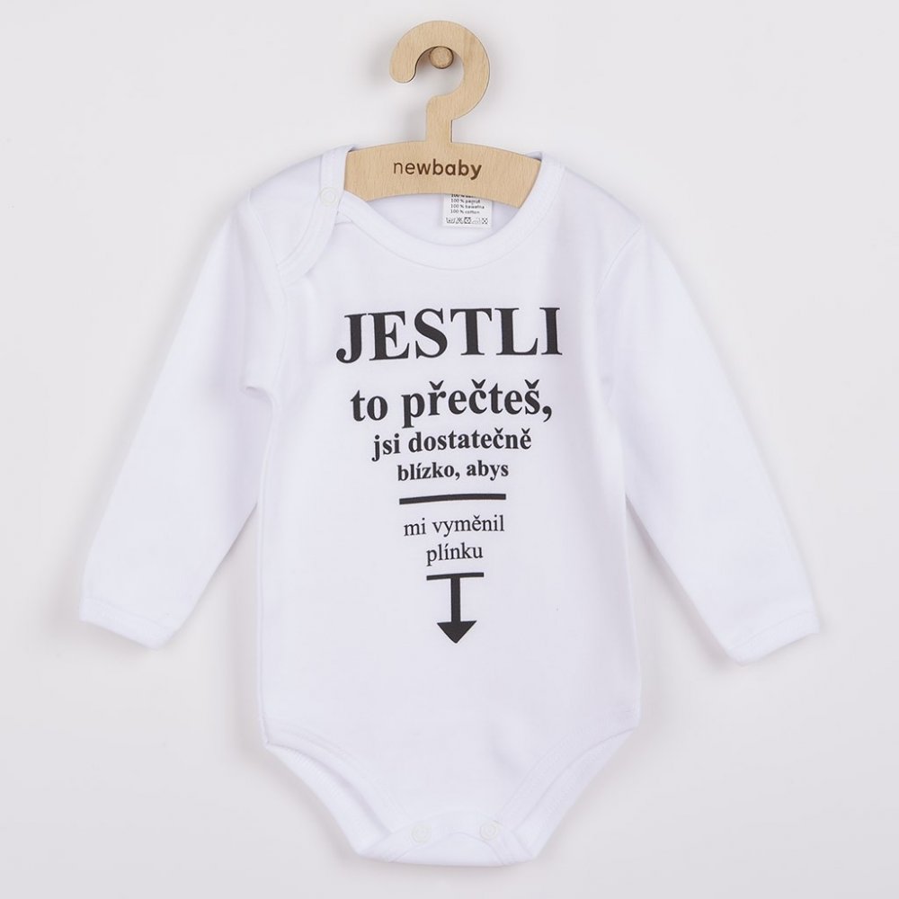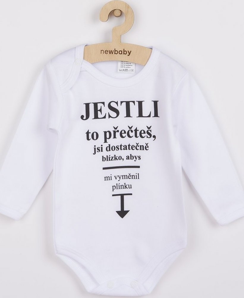 Originální bavlněné kojenecké body s dlouhým rukávem New Baby, s vtipným nápisem JESTLI to přečteš, jsi dostatečne blízko, abys mi vyměnil plínku. Barvy použité k potisku jsou certifikované a vhodné pro miminka. Je vyrobeno z příjemného a kvalitního materiálu, ve kterém se bude Vaše miminko cítit příjemně. Body má zapínáni na cvočky na ramínku a mezi nožičkami, což usnadňuje oblékání a přebalování...