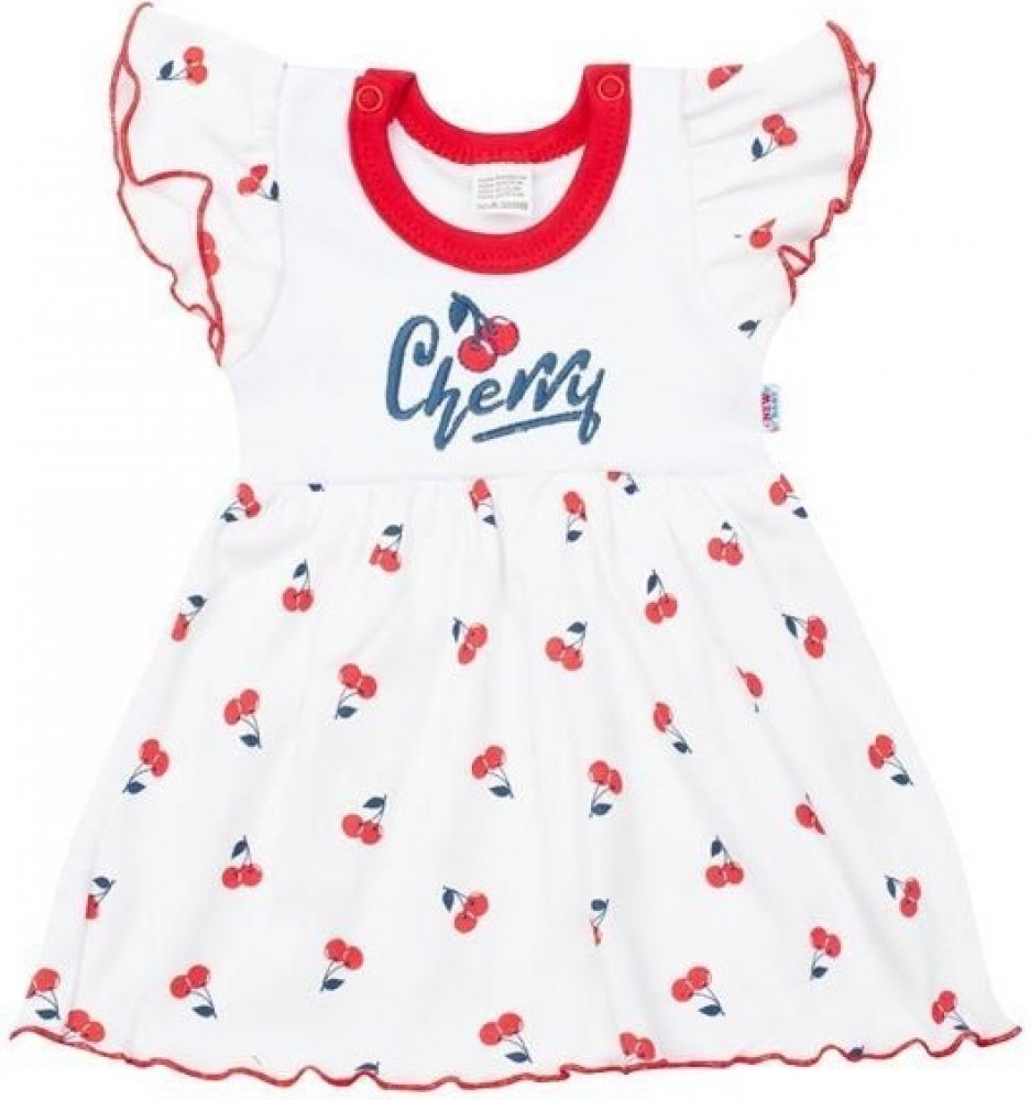 Kojenecké šatičky české značky New Baby Cherry pro všechny malé parádnice. Šatičky s krátkým volánkovým rukávem celopotištěné třešničkami, jsou ušity ve tvaru písmene A. Vrchní část je zdobena nášivkou Cherry s třešničkami. Nášivka je podlepená proti poškrábání. Spodní část má krásně nařasenou sukýnku, která je celopotištěná třešničkami. Okolo krčku, rukávů a sukýnky je červené lemování.