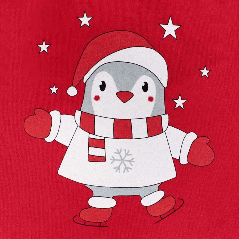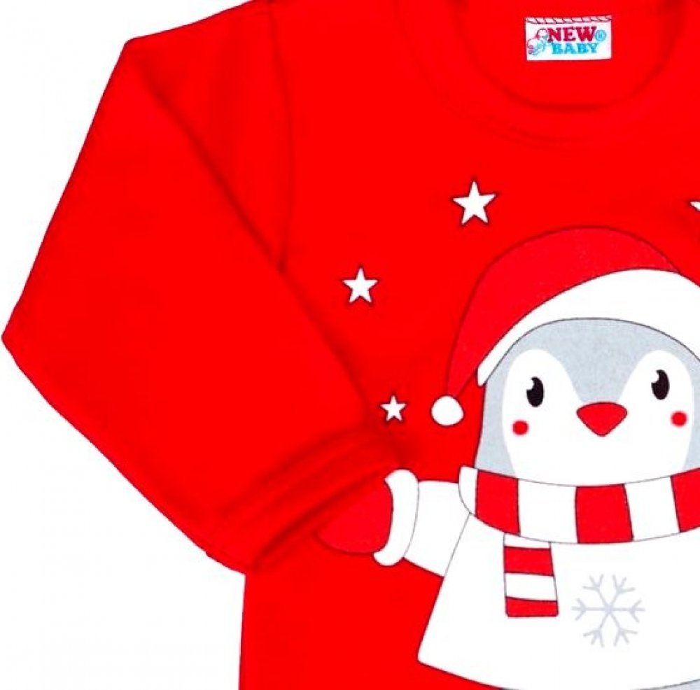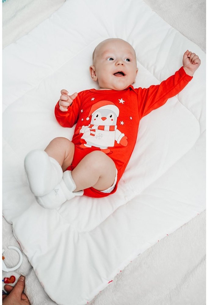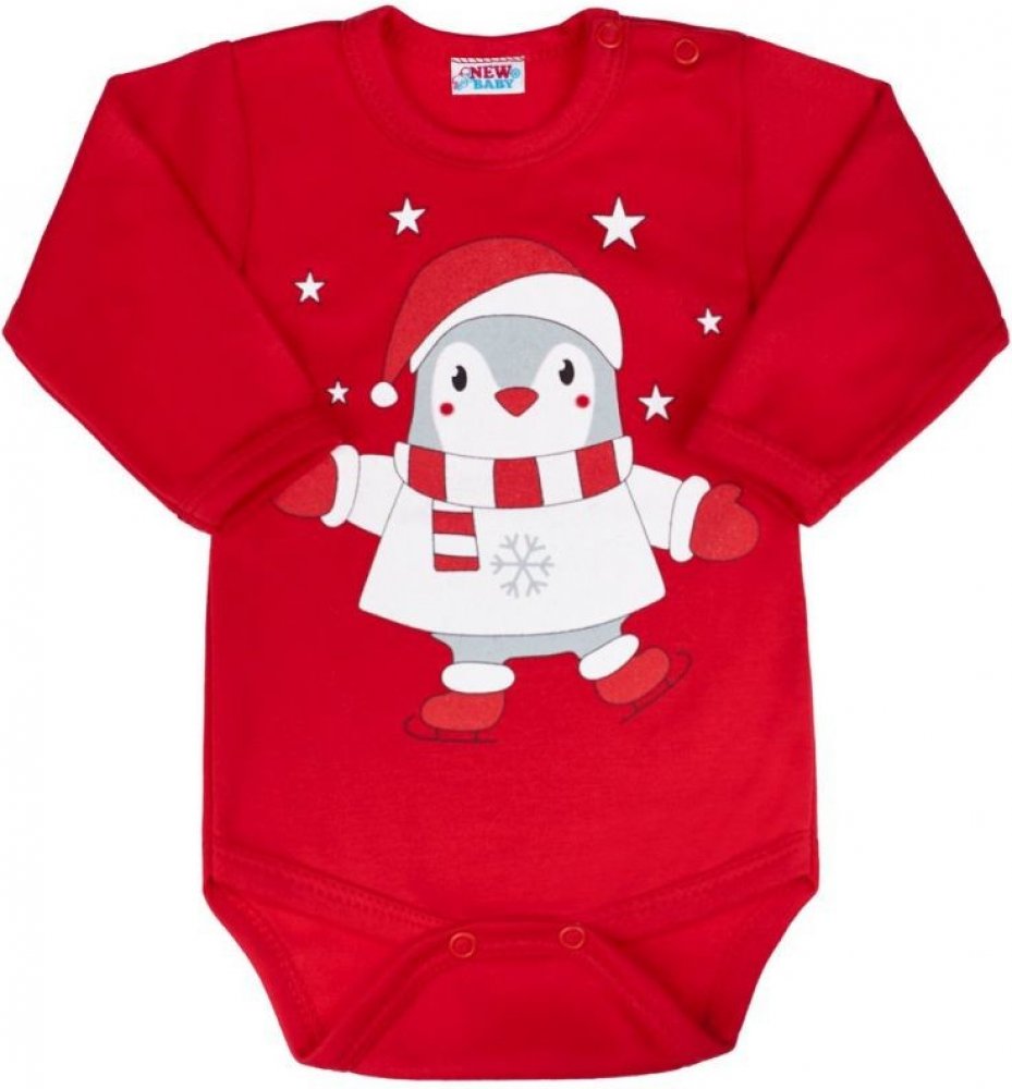 Kojenecké body s dlouhým rukávem New Baby Winter Penguin. Body je v krásné červené barvě a je zdobeno roztomilým a veselým tučňáčkem. Zapínání na cvočky na ramínku a mezi nožičkami usnadňuje oblékání a přebalování miminka. Naše body je vhodné pro kluky i holčičky a s roztomilým zimním motivem, budou při vánočním stromečku neodolatelné. Složení: 100% bavlna.