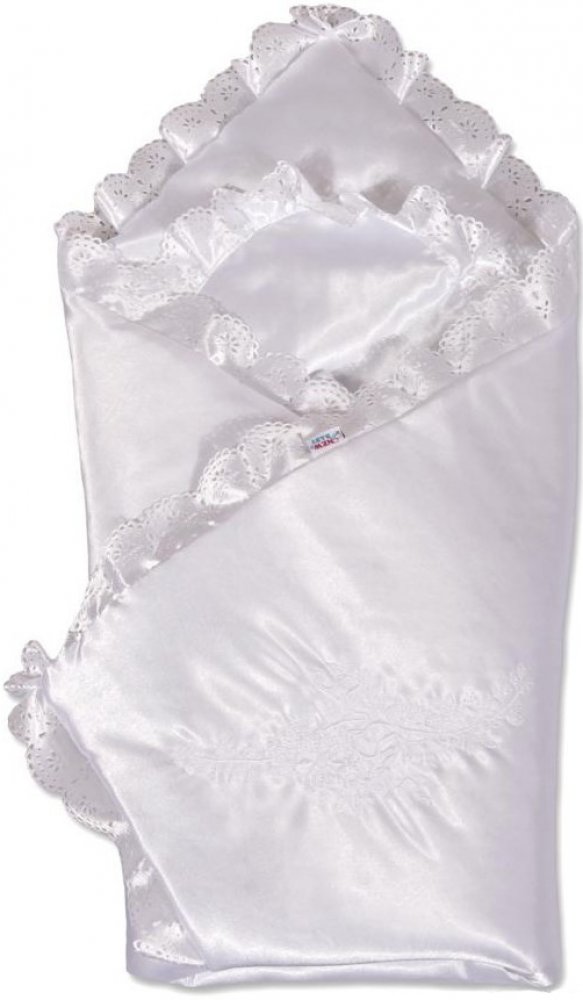 Saténová dětská zavinovačka na suchý zip s krajkou. Rozměry 80x80 cm. Složení 100%polyester.- nejsou použity žádné knoflíky ani žádné další plastové nebo ocelové části, které mohou být pro Vaše dítě nebezpečné- materiál, který je používán pro výplň, je 100% protialergický, což znamená, že se v jeho vláknech nešíří žádné mikroorganismy ani plíseňBarva: Bílá