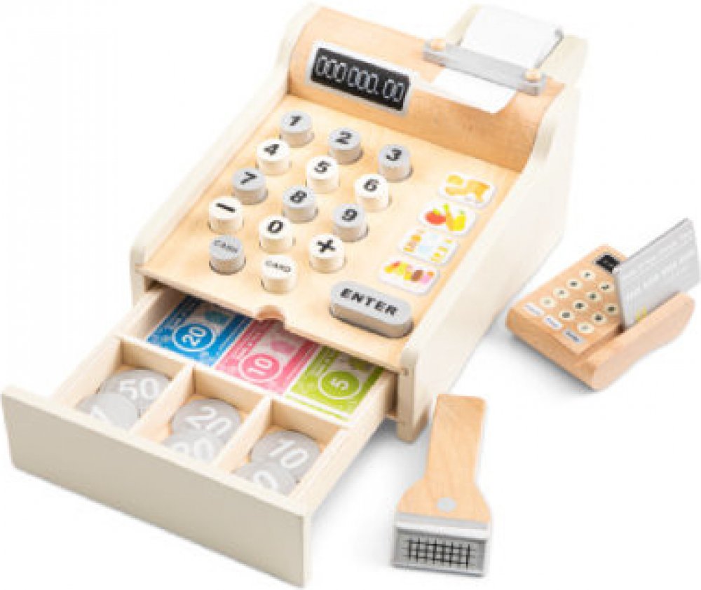 Podrobnosti o produktu: Cha-ching! Malé děti se rády naučí počátečním matematickým a rozumovým dovednostem. Hra s touto pokladnou je pro děti skvělým způsobem, jak rozvíjet sociální a jazykové dovednosti. Inspiruje také k nápadité hře a umožňuje rozvíjet vypravěčské schopnosti. Tato pokladna je vybavena výsuvnou zásuvkou, skenerem, čtečkou karet, rolí na peníze a 30 kusy hracích peněz, 8 dřevěnými mincemi a dřevěnou kreditní kartou. Rozměry a hmotnost: Rozměry balení (délka x výška x šířka): 21 x 12 x 17,5 cm Hmotnost: 1 kg Materiál a péče: Materiál: dřevo